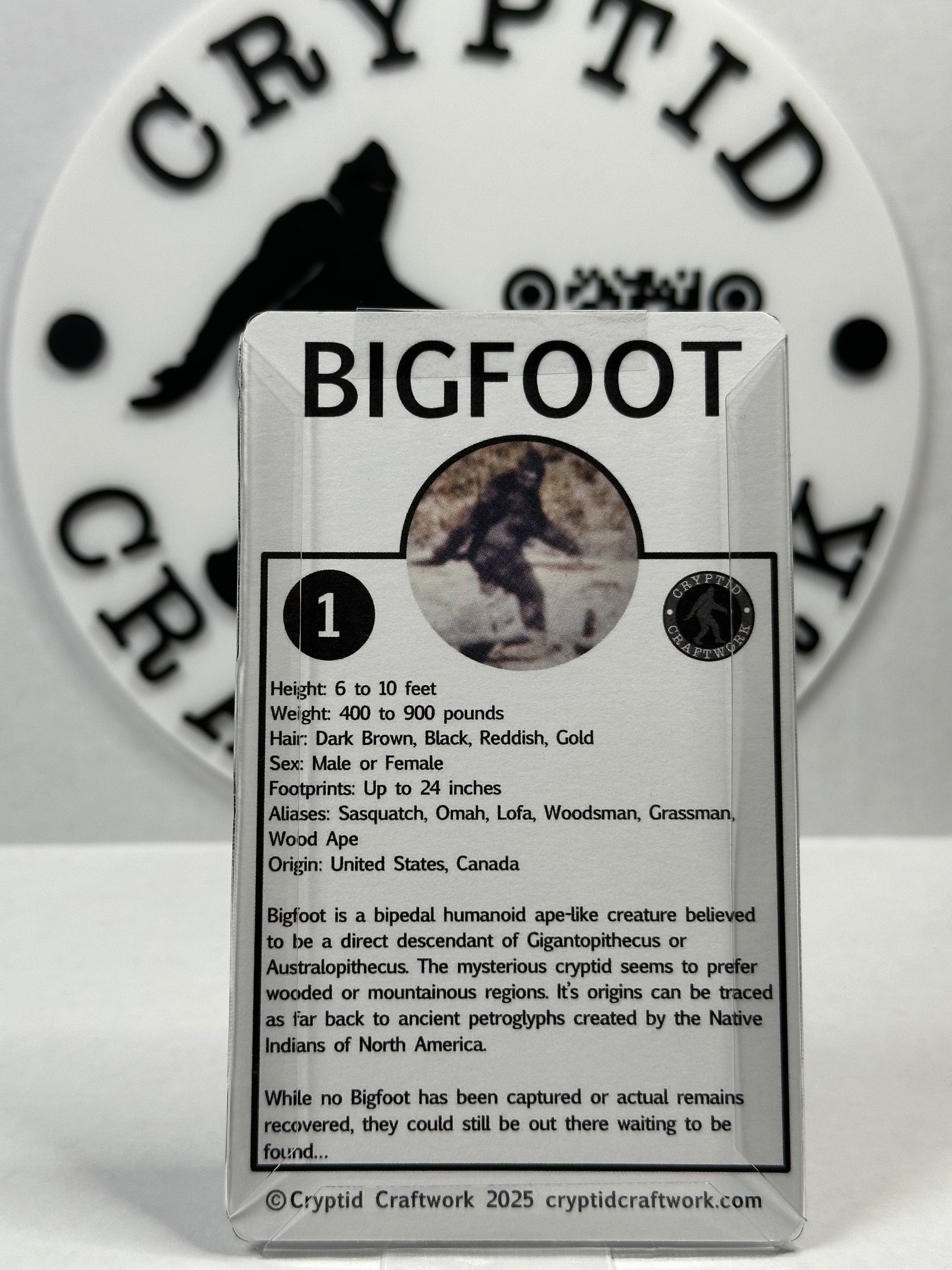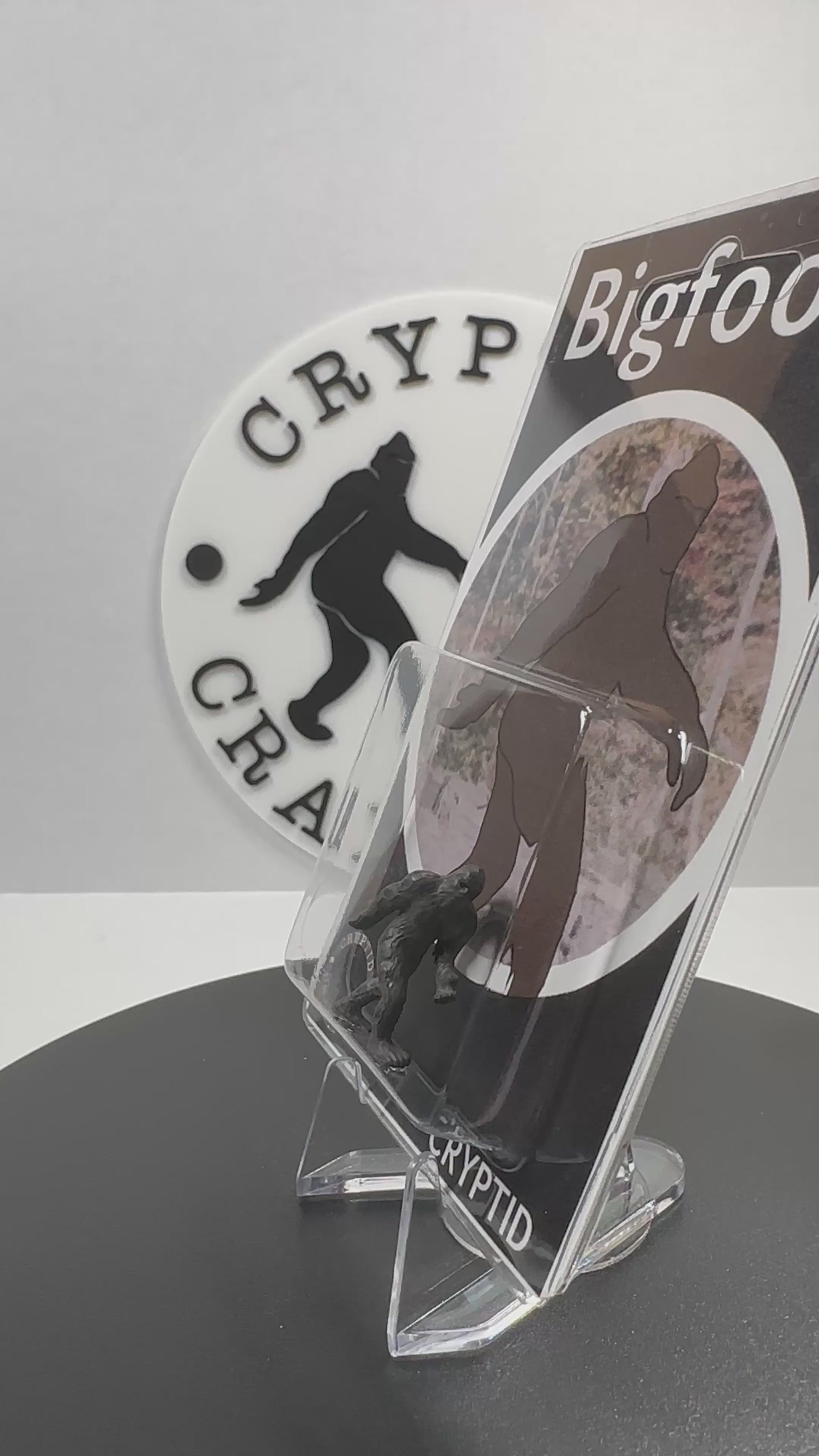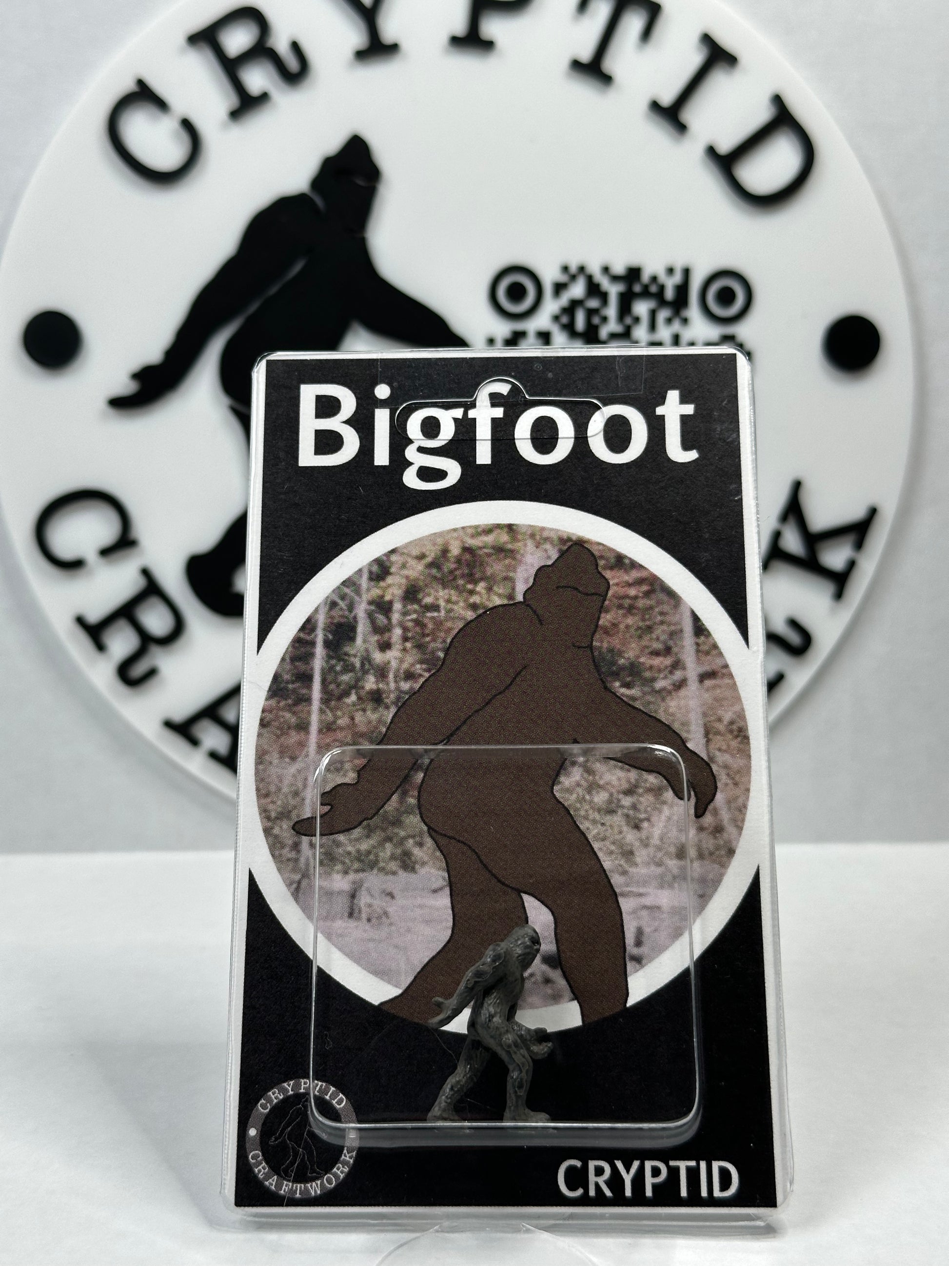 The mini Bigfoot figure measures roughly 1” tall, is mounted to a clear bubble backed with a vintage retro style card that measures inches 3 inches (wide) x 5 inches (tall) and will include an additional backer card. (clear stand not included)