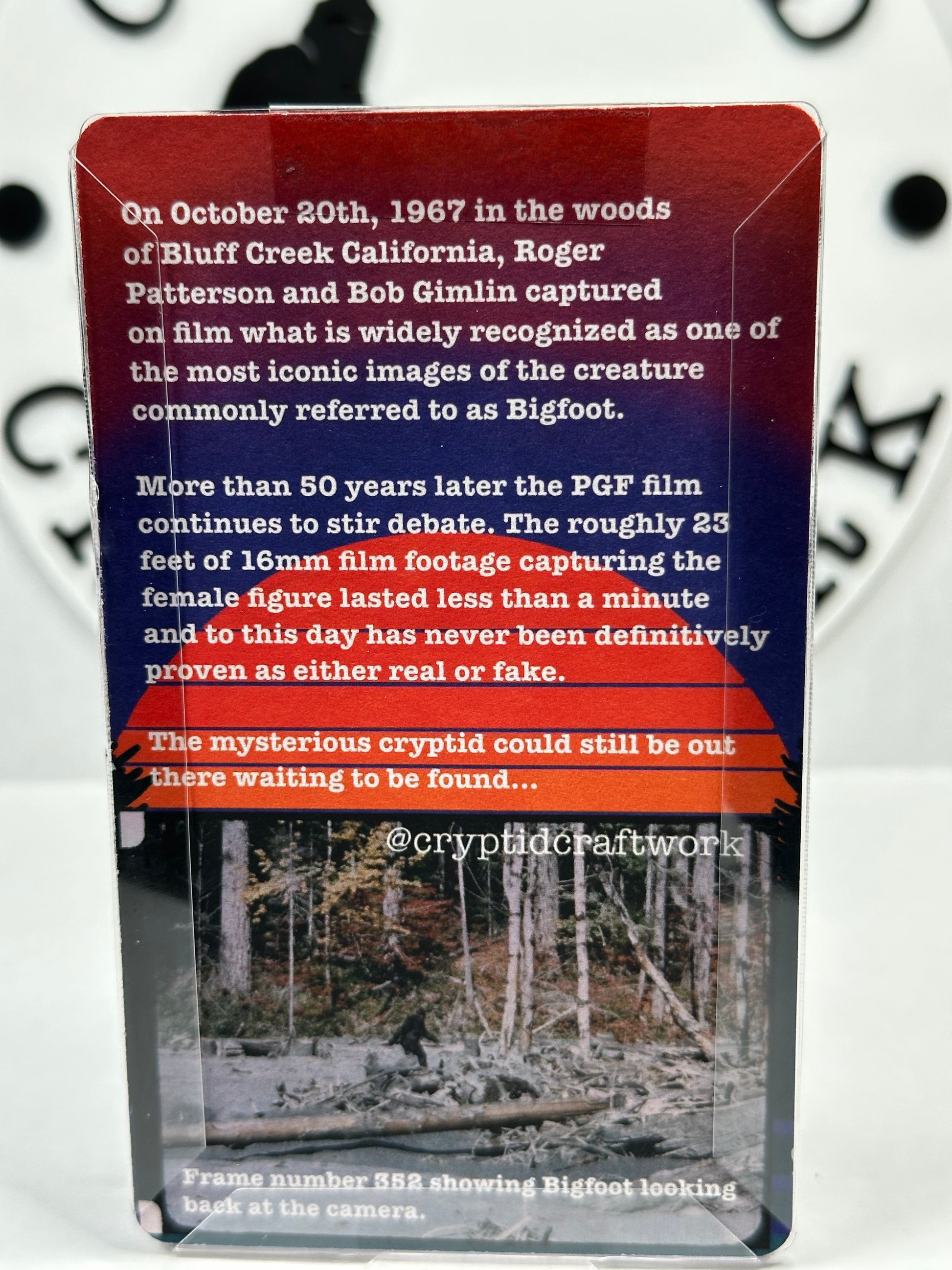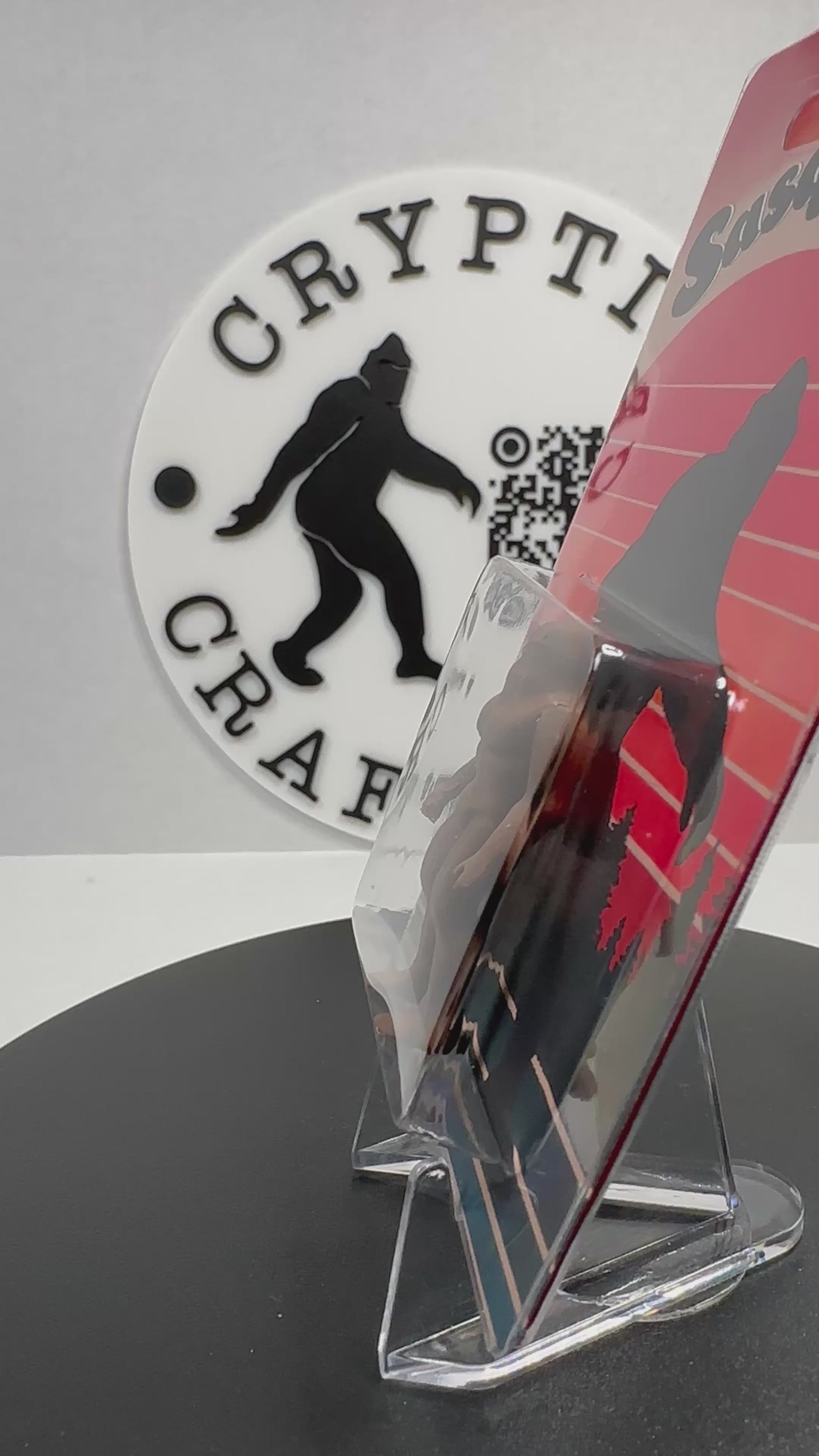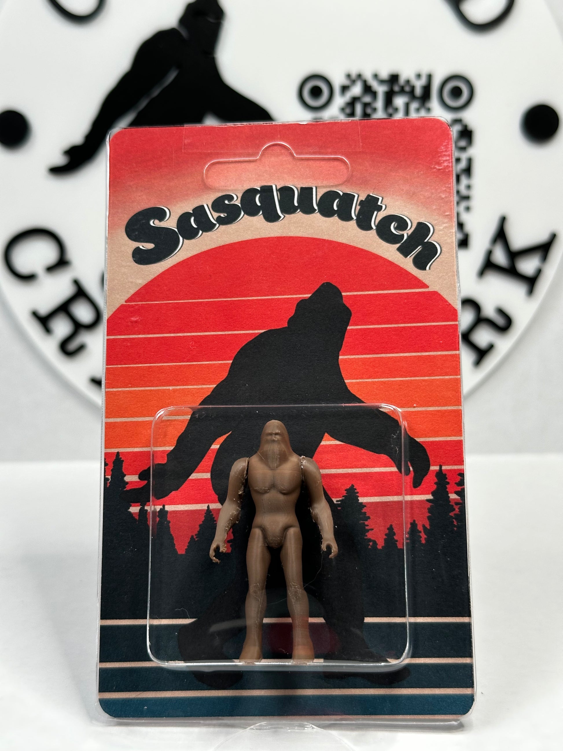This miniature Sasquatch figure is styled to look like a retro action figure and measures roughly 2” tall, is mounted to a clear bubble backed with a vintage retro style card that measures inches 3 inches (wide) x 5 inches (tall) and includes an additional backer card! (clear stand not included)