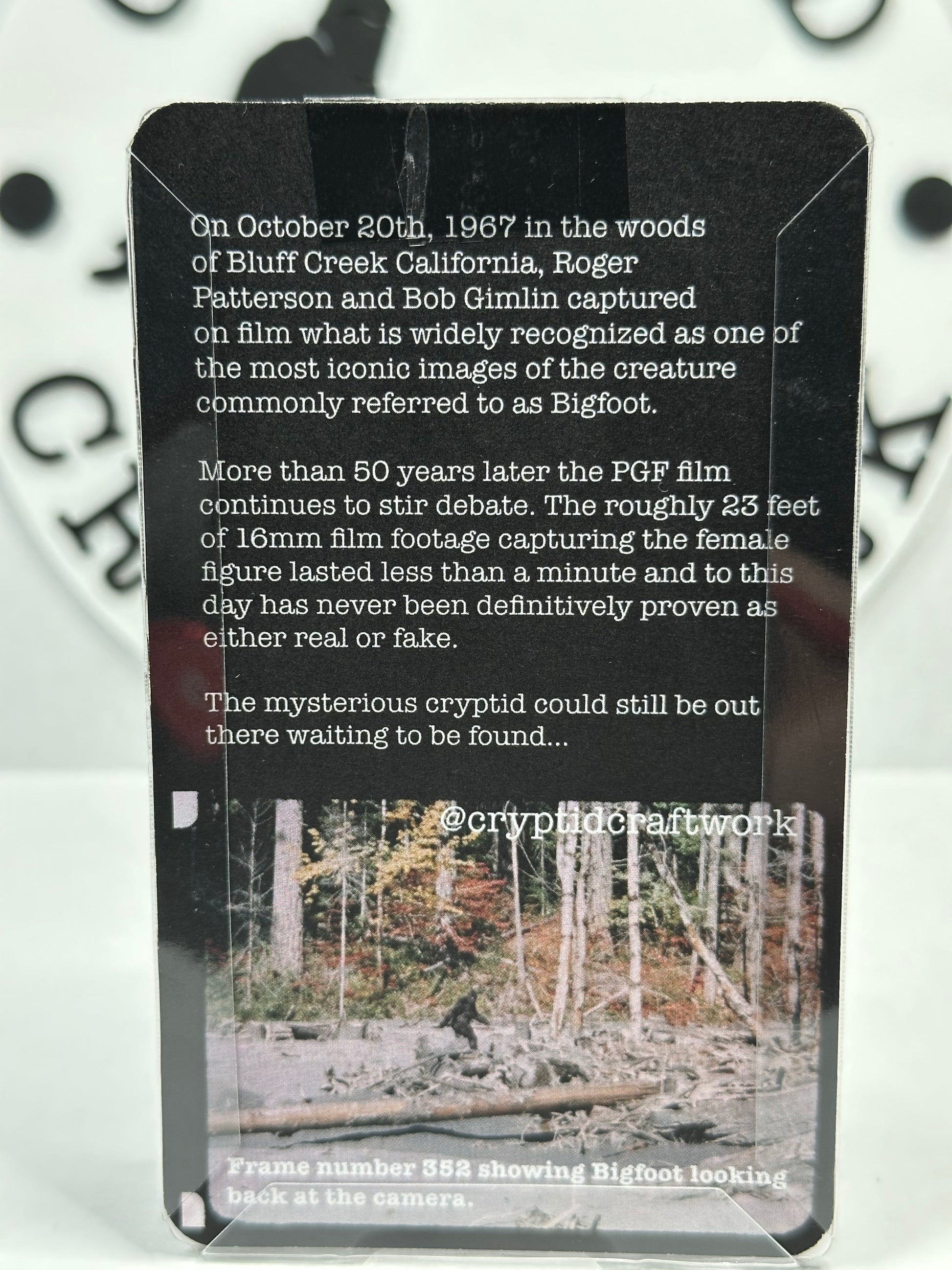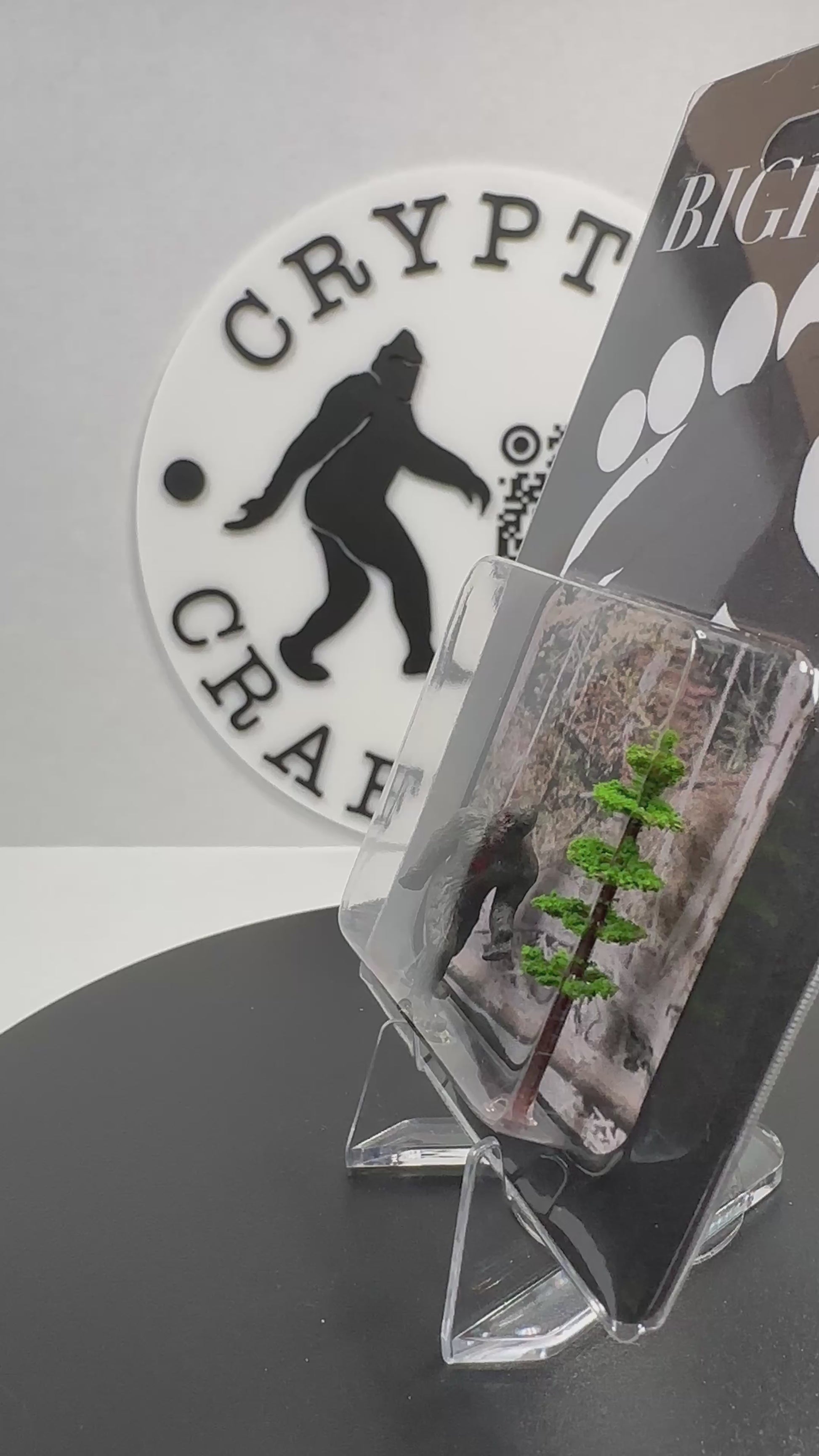 This mini Bigfoot figure measures roughly 1” tall, comes with a tree and is mounted to a clear bubble backed with a vintage Noir style black & white card that measures inches 3 inches (wide) x 5 inches (tall). This design was created to celebrate the original PGF Bigfoot film and will ship with an additional collectible backer card. (clear stand not included)