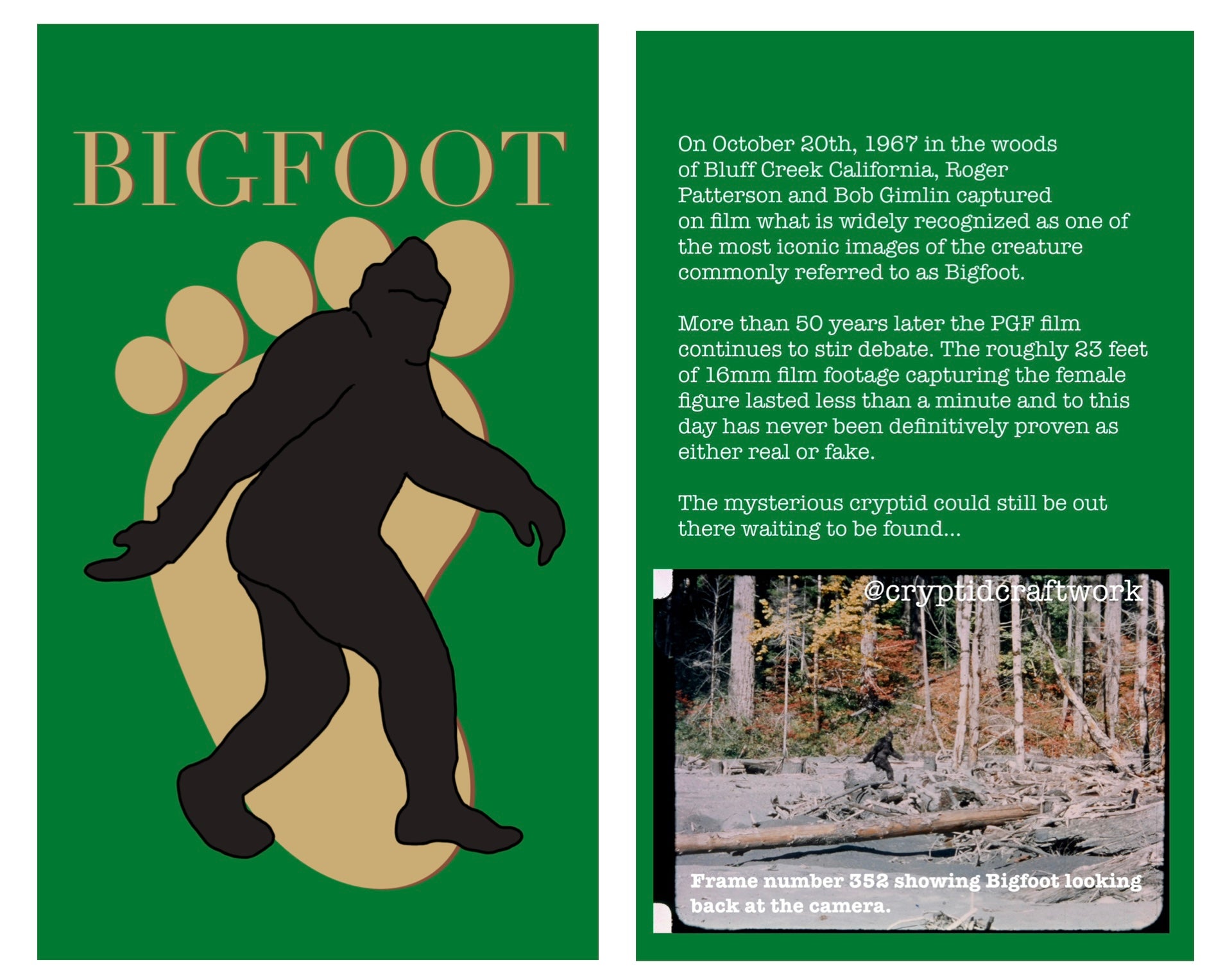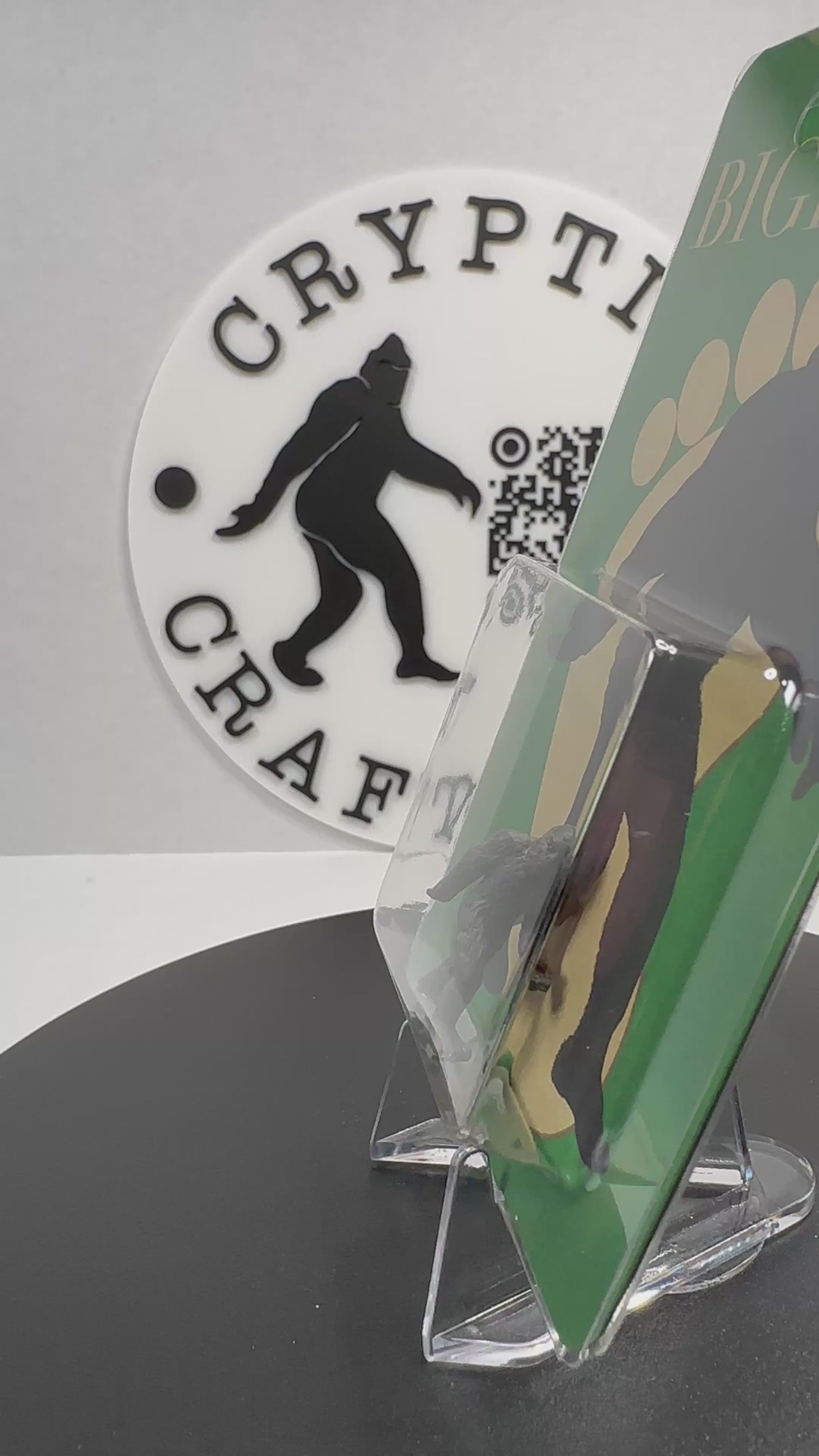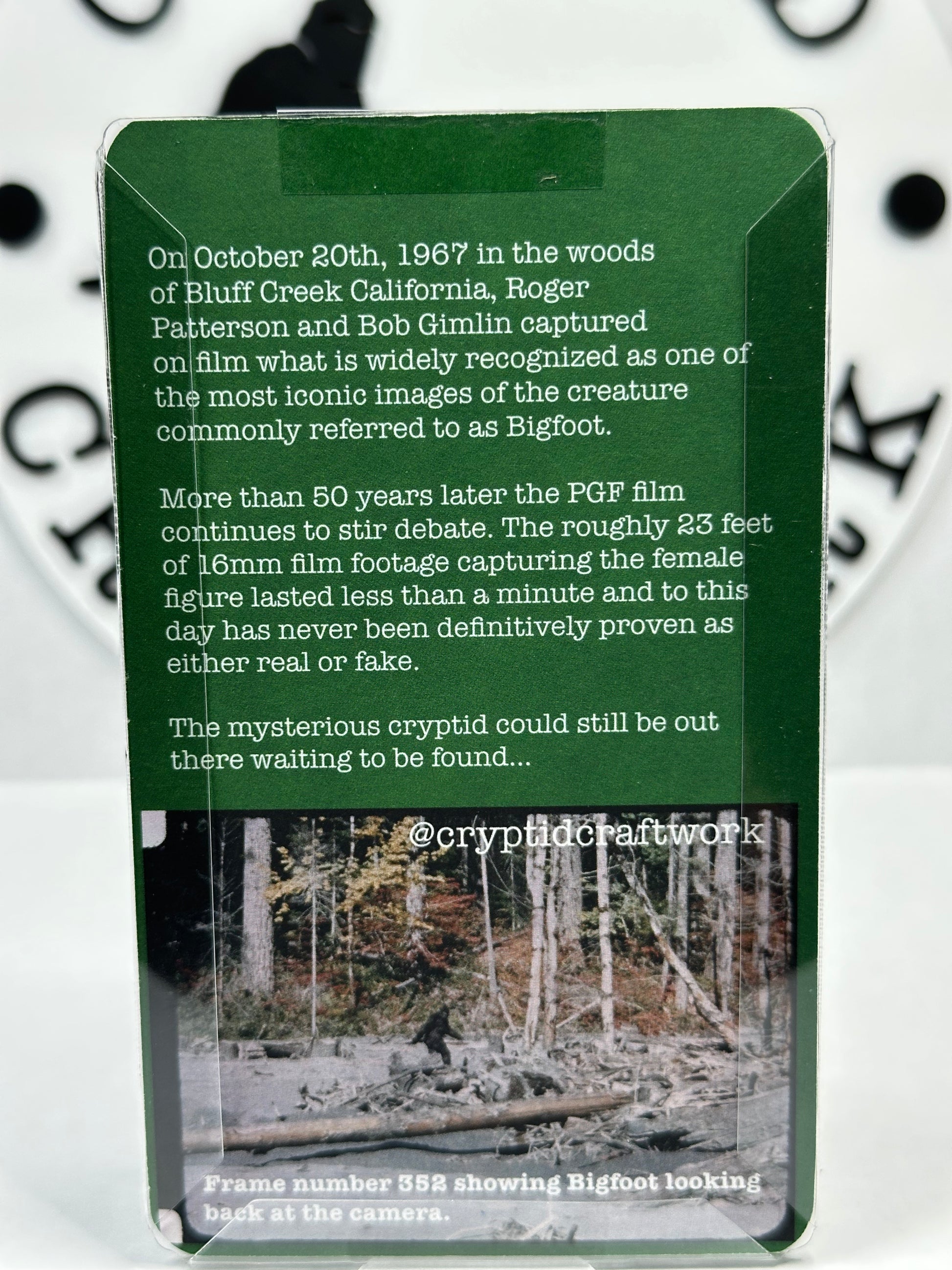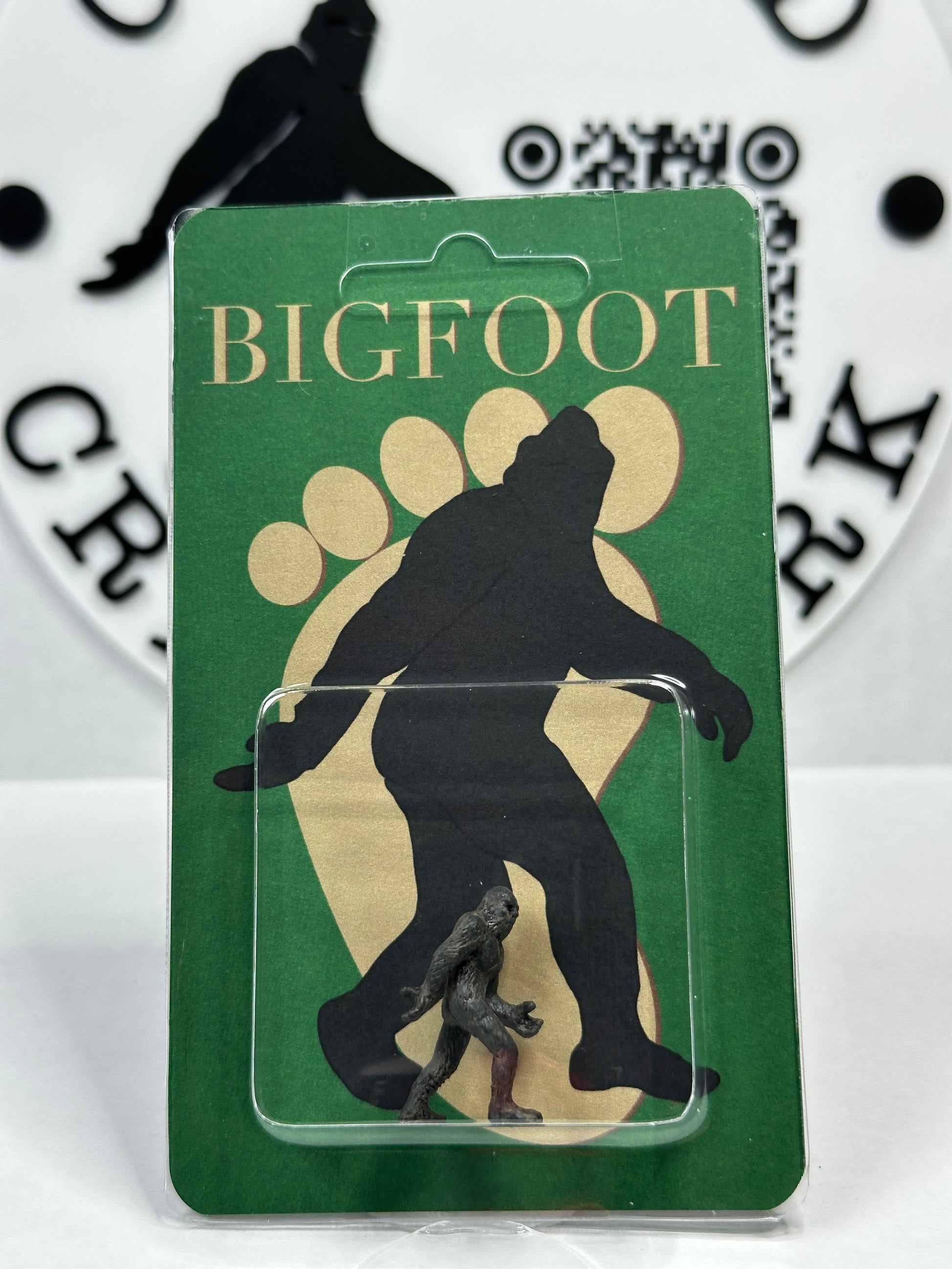 This mini Bigfoot figure measures roughly 1” tall, is mounted to a clear bubble backed with a vintage retro green card that measures inches 3 inches (wide) x 5 inches (tall). This design was created to celebrate the original PGF Bigfoot film and will ship with an additional collectible backer card. (clear stand not included)