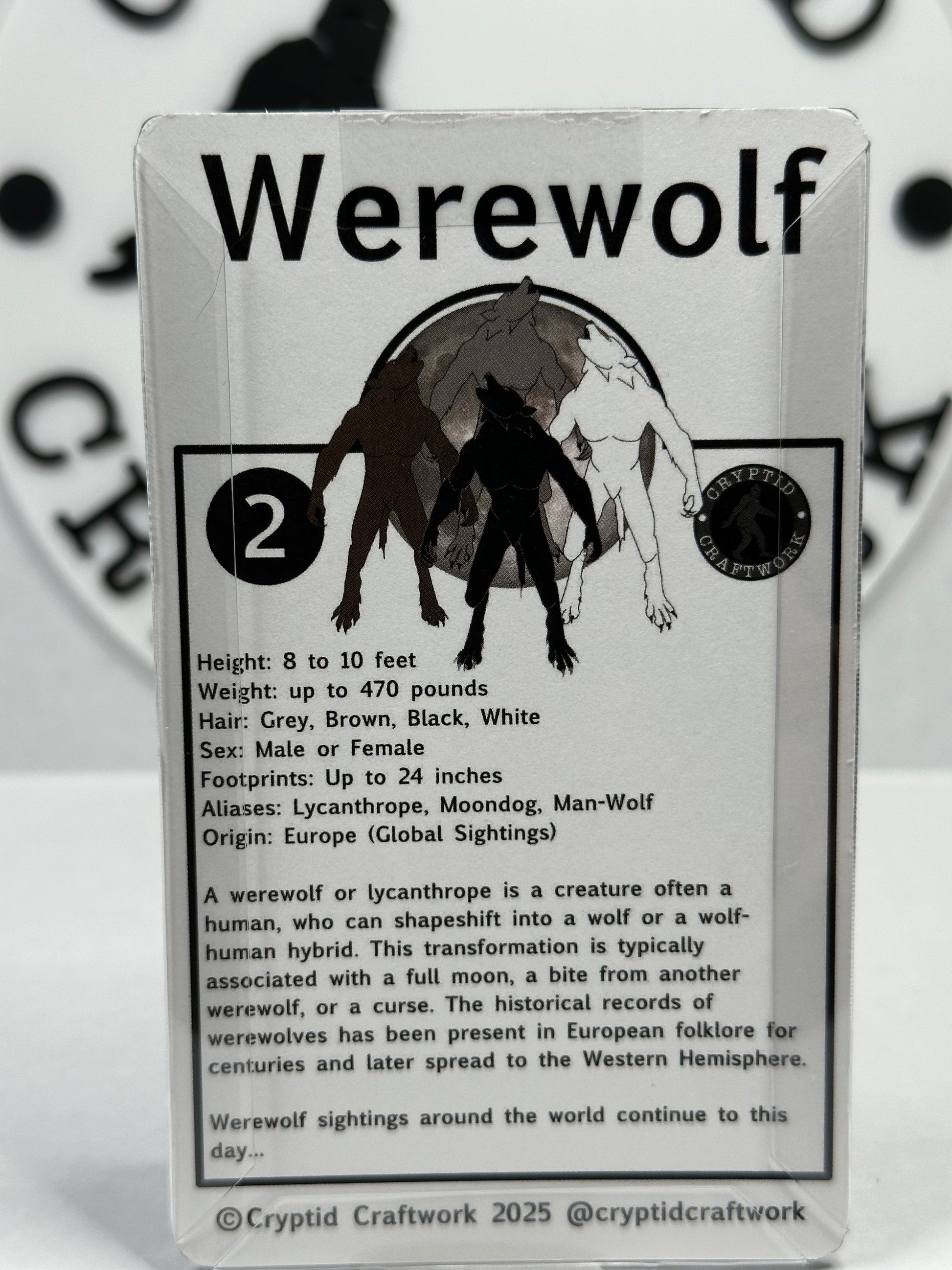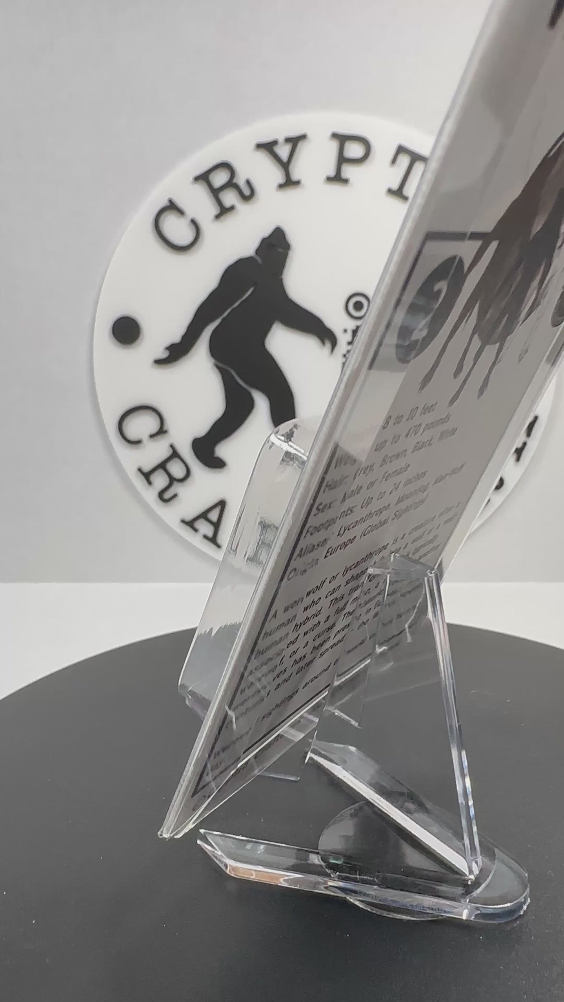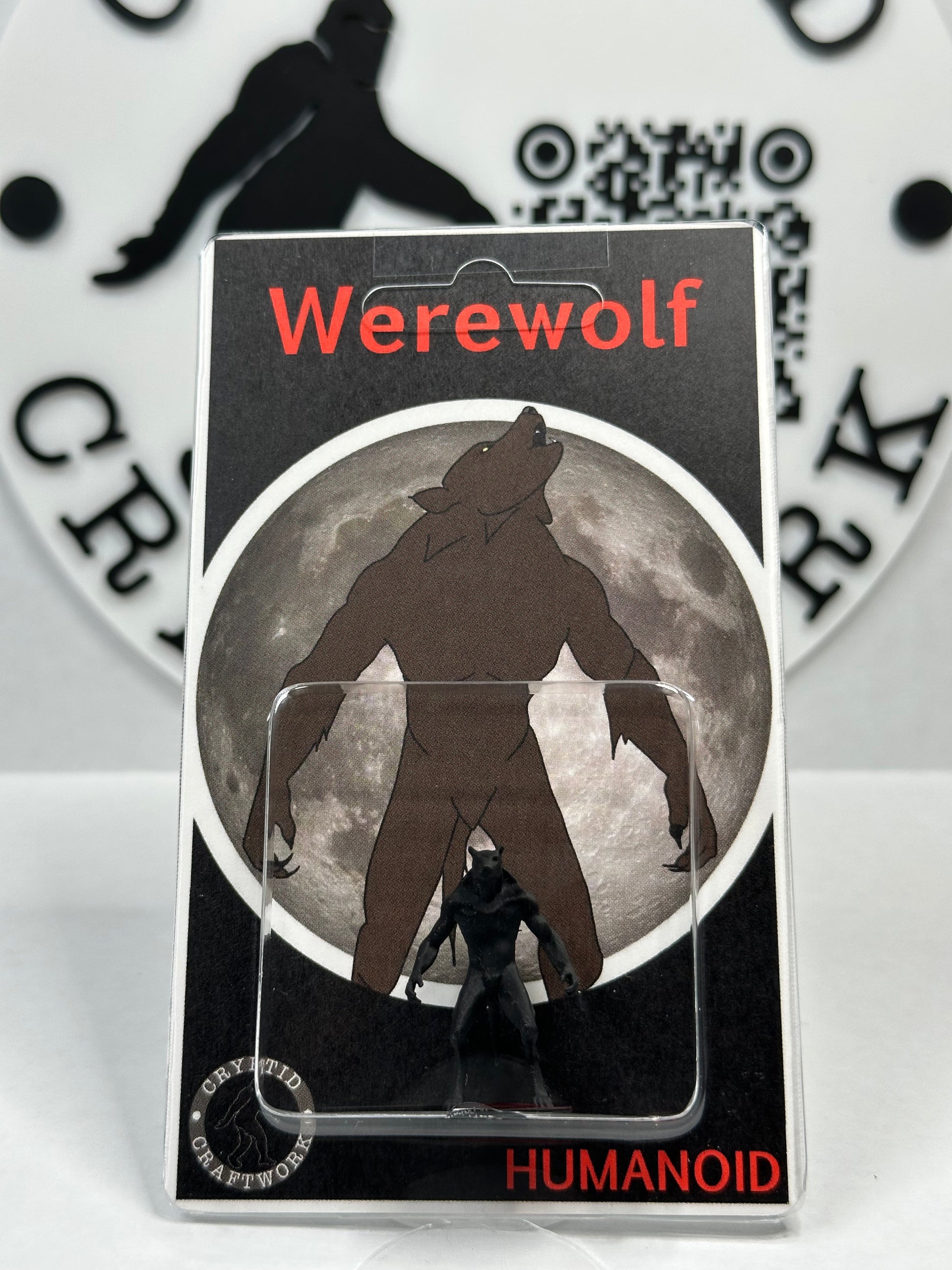 This mini Black Werewolf or Lycan figure measures roughly 1” tall, is mounted to a clear bubble backed with a vintage retro style card that measures inches 3 inches (wide) x 5 inches (tall) and will include an additional backer card. (clear stand not included)