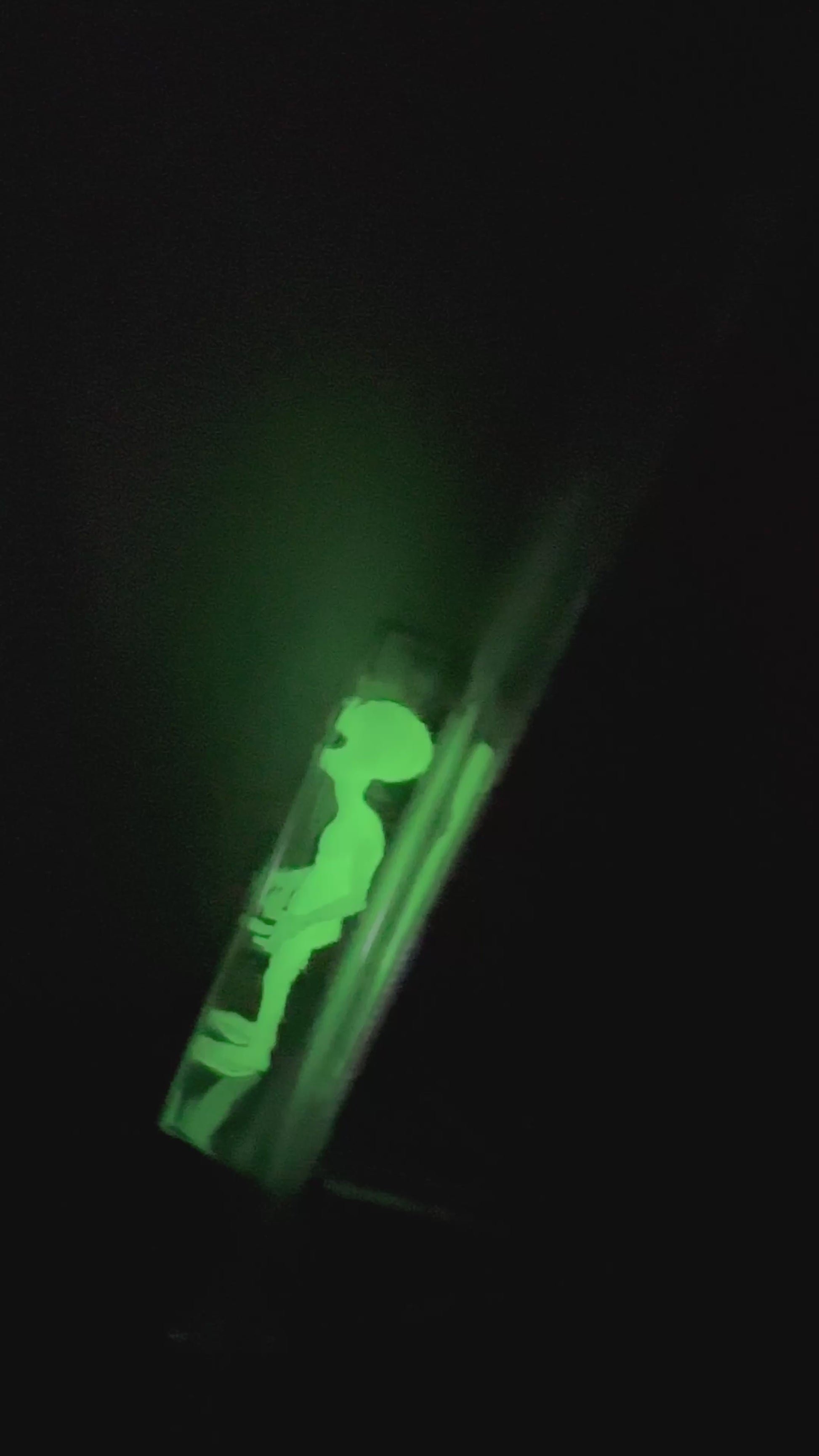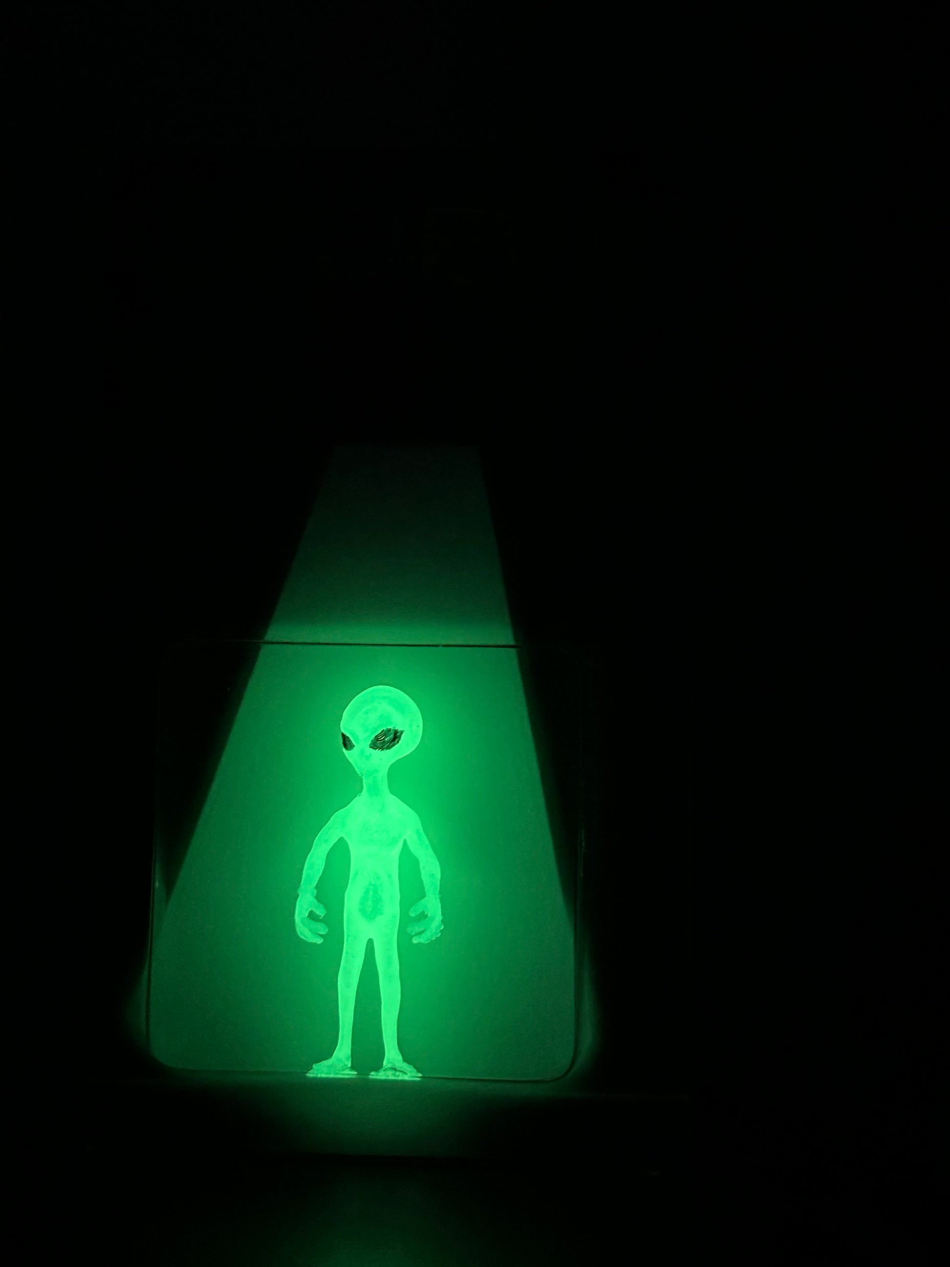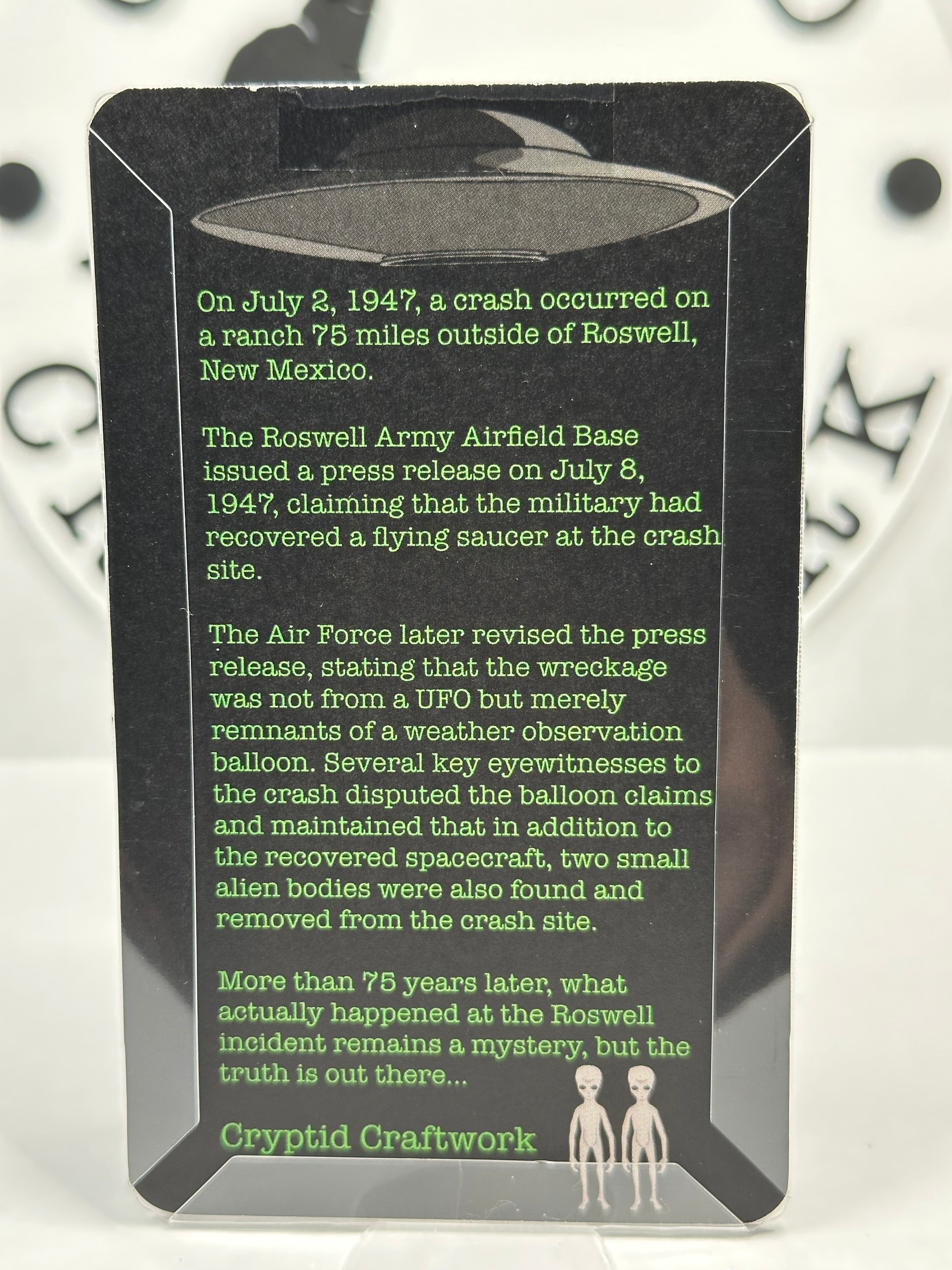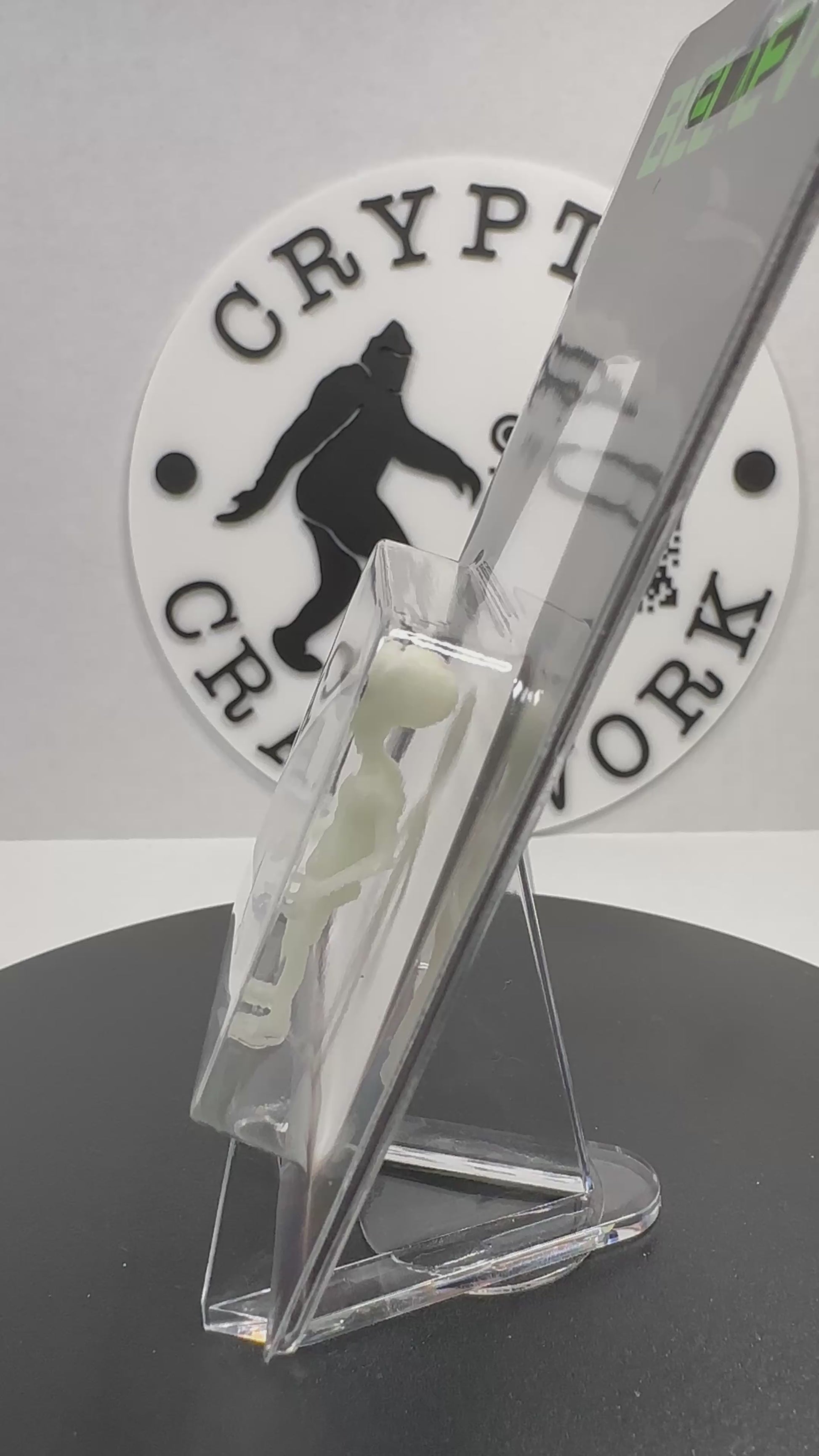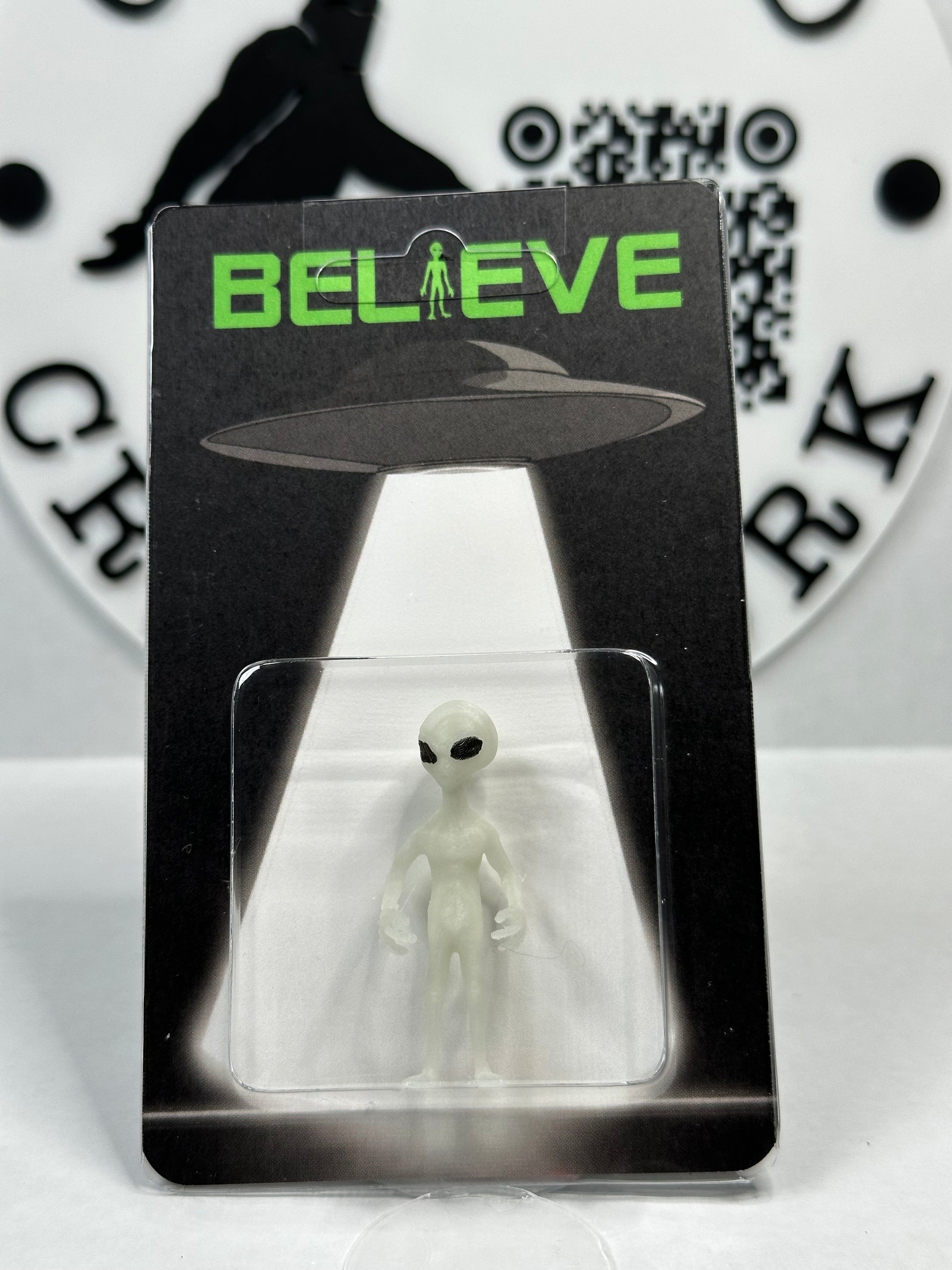 This mini Alien UFO figure measures roughly 2” tall, glows in the dark and is mounted to a clear bubble backed with a vintage retro style card that measures inches 3 inches (wide) x 5 inches (tall), will include an additional backer card. (clear stand not included)