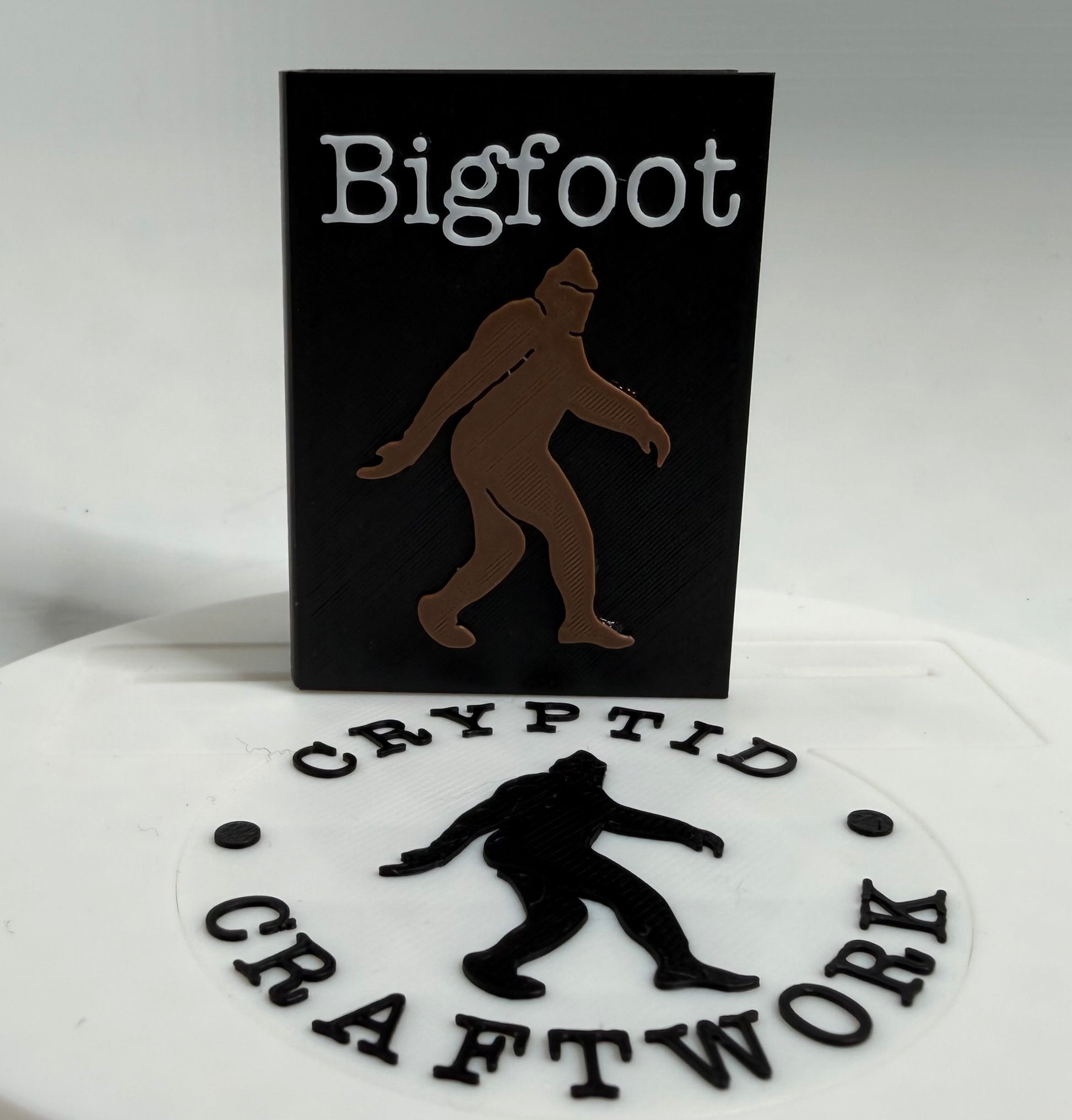 Kicking off our brand new Cryptid Miniature Book series with none other than Bigfoot! This miniature figure stands around 2 inches tall, is designed to look like a 1970's style retro action figure. The best part is Bigfoot can be stashed away inside of a container styled to look like a miniature book. The figure locks in place in the book insert or removed to display. Will make a great addition to any fan of Bigfoot, Sasquatch, Yeti or the Abominable Snowman. You will receive the little black book cover, insert and Bigfoot figure as shown and everything is made from PLA Plastic.