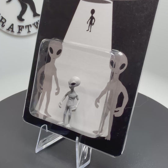 This mini Art Deco Grey Alien UFO Abduction Believe figure measures roughly 1” tall, is mounted to a clear bubble backed with a vintage retro style card that measures inches 3 inches (wide) x 5 inches (tall) and will include an additional backer card. (clear stand not included)