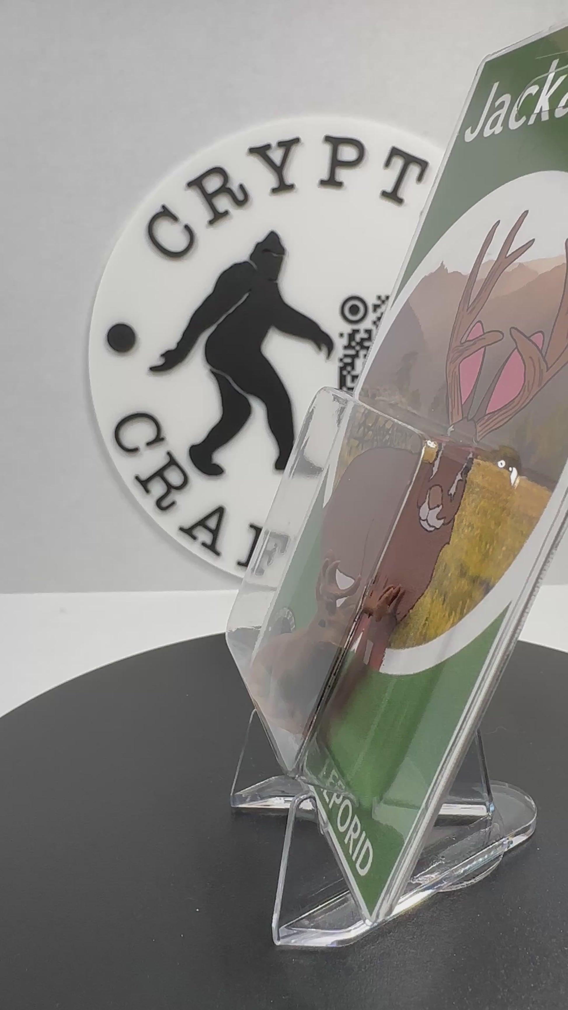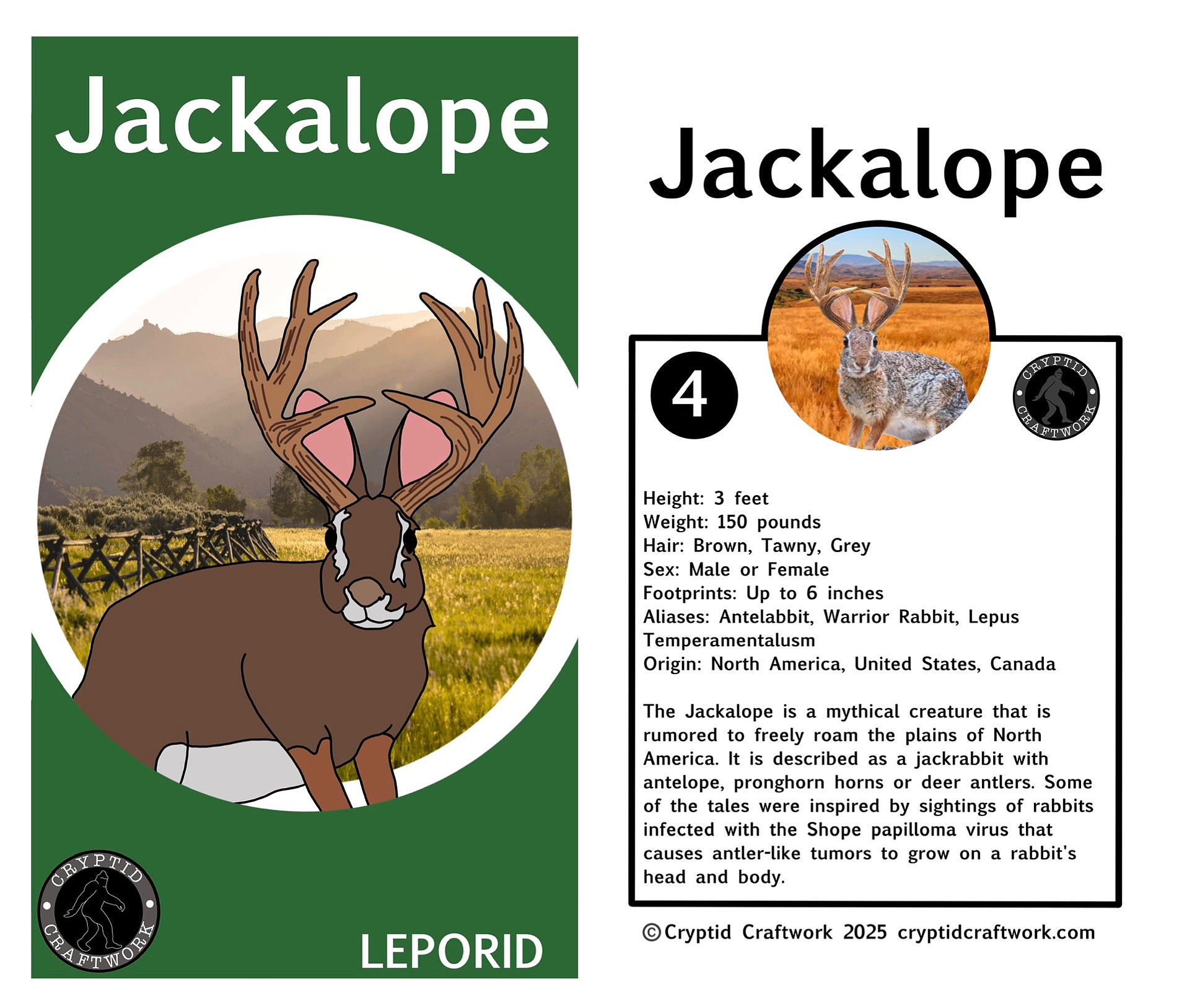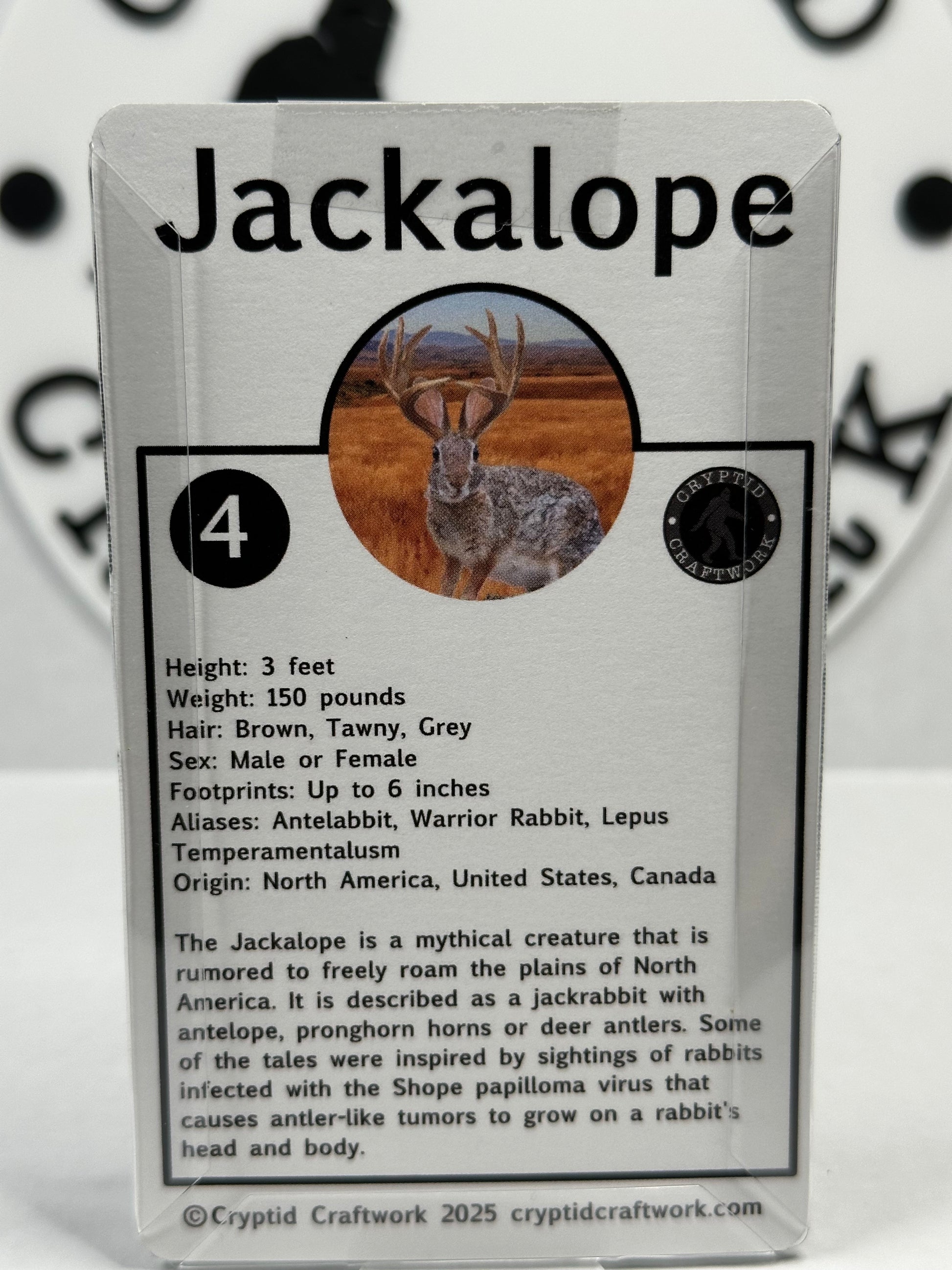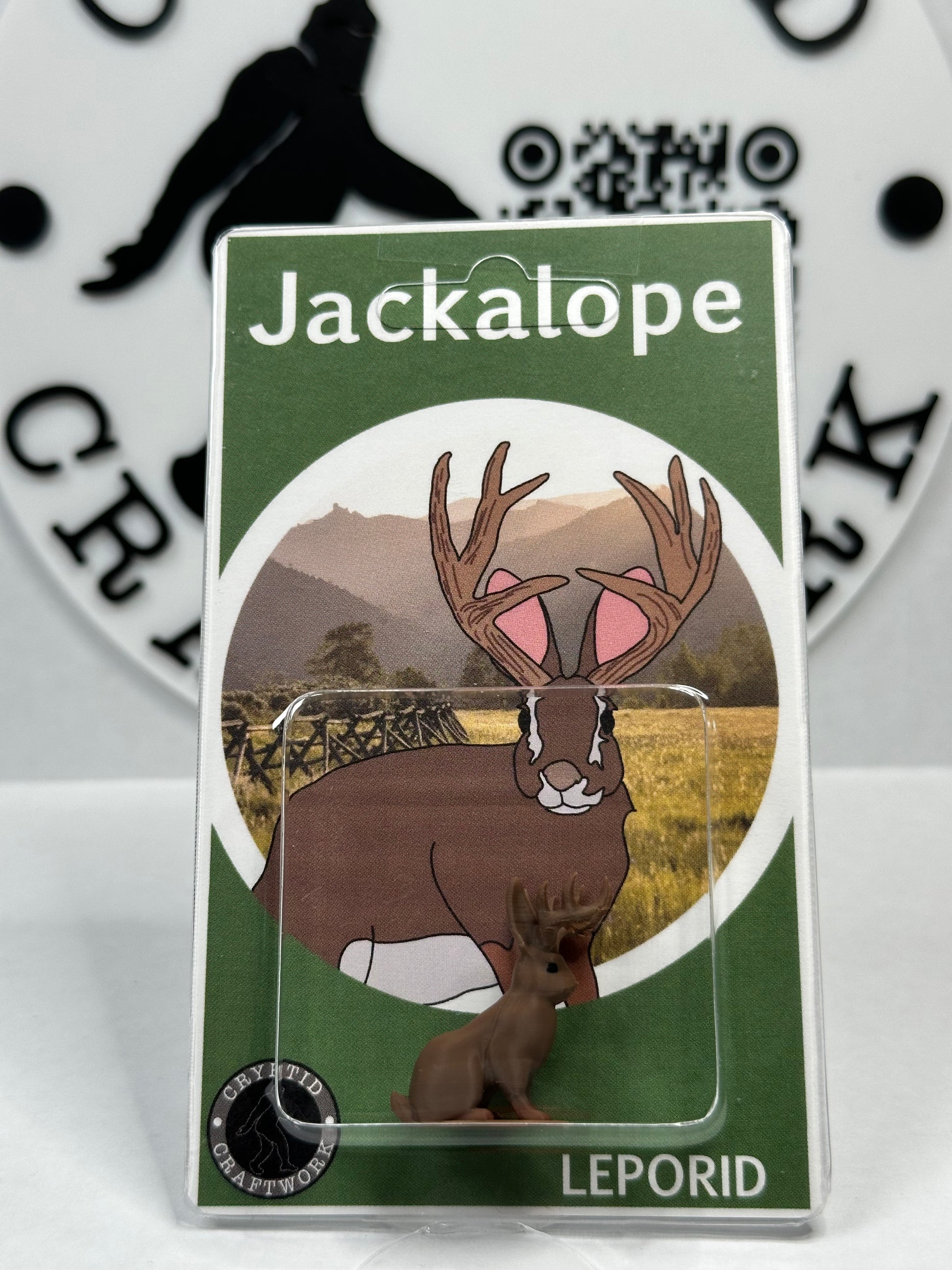 This mini Jackalope figure measures roughly 1.5” tall, is mounted to a clear bubble backed with a vintage retro style card that measures inches 3 inches (wide) x 5 inches (tall) and includes an additional backer card. (clear stand is not included)