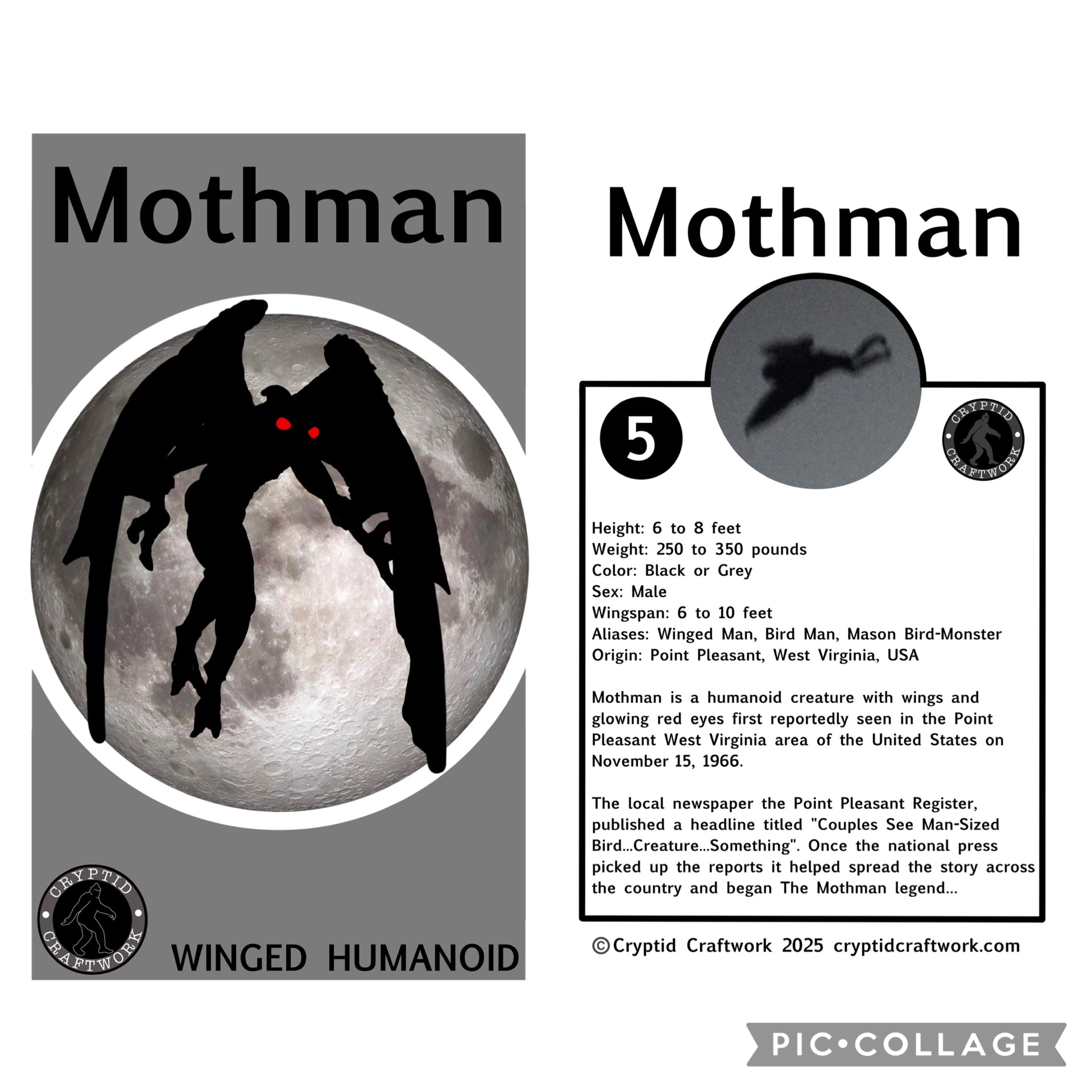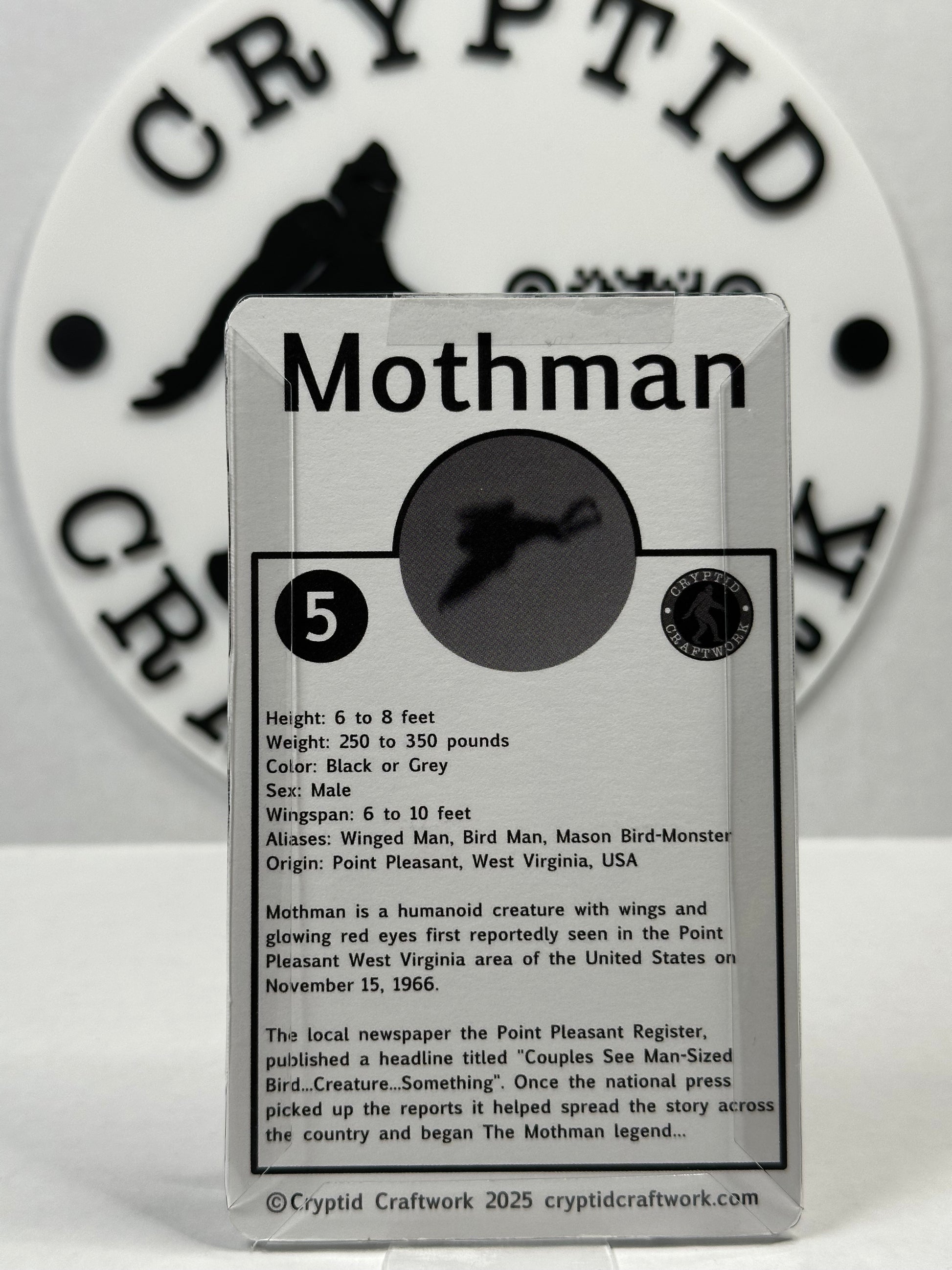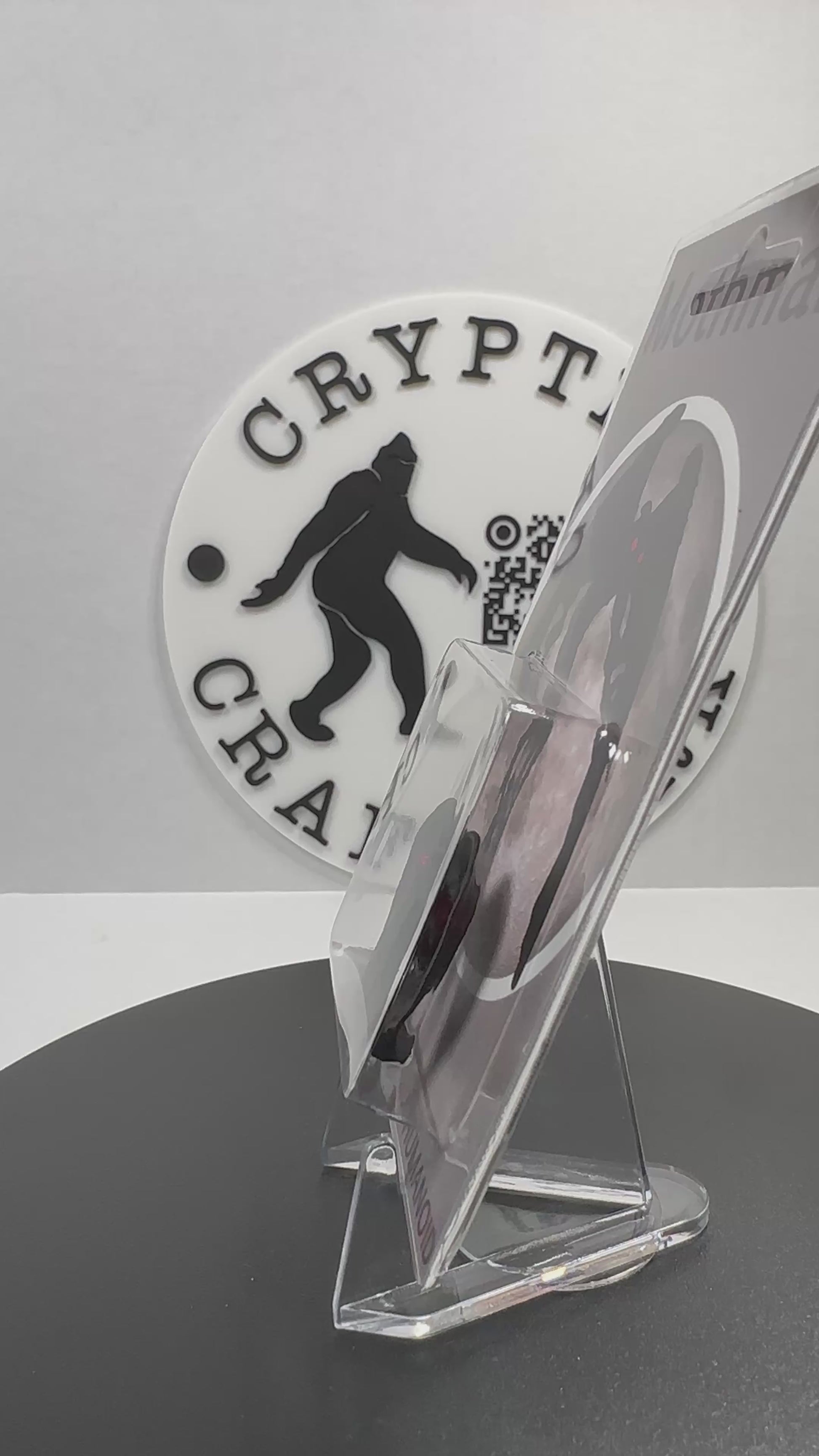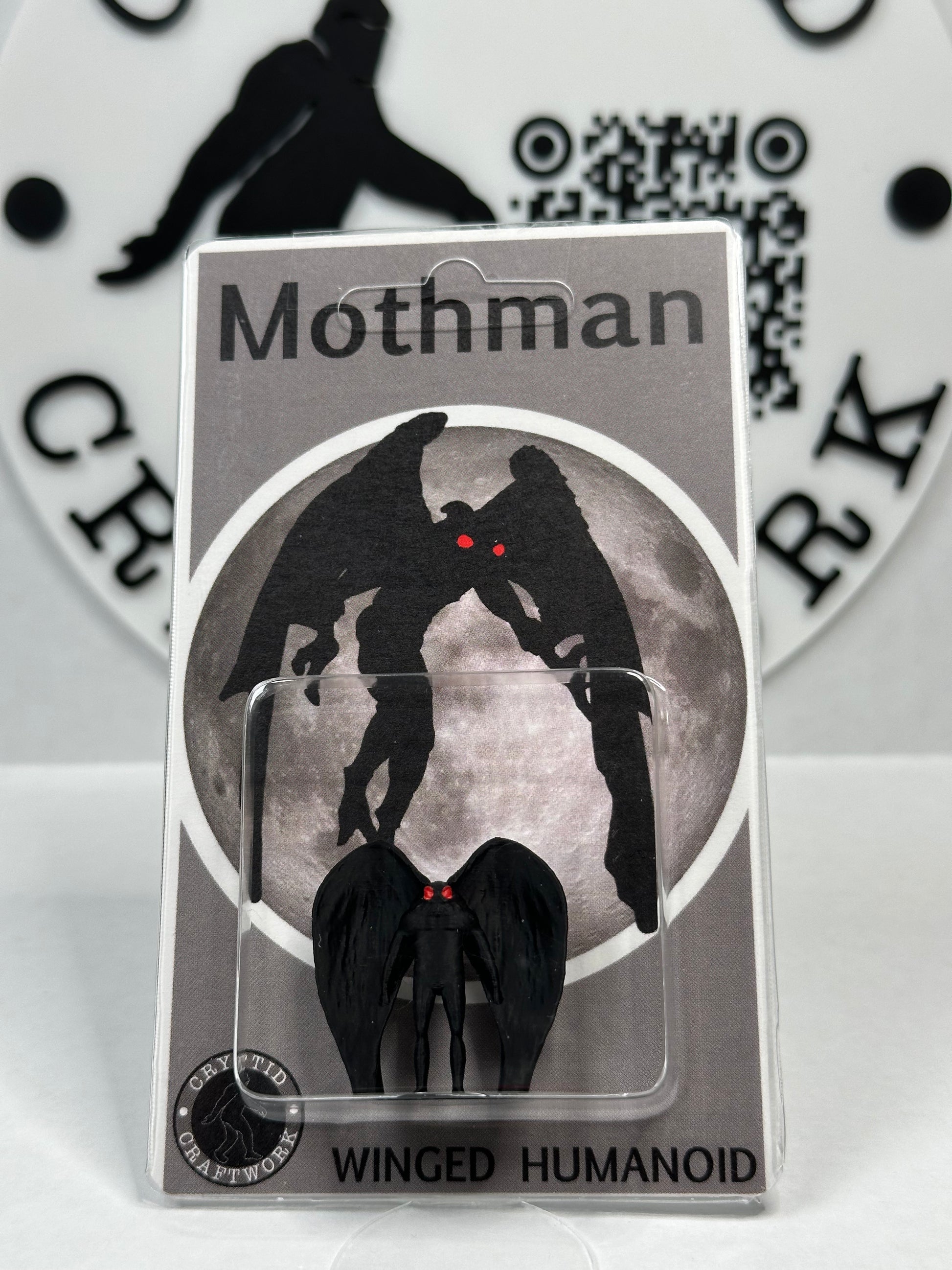 This mini Mothman figure measures roughly 1” tall, is mounted to a clear bubble backed with a vintage retro style card that measures inches 3 inches (wide) x 5 inches (tall) and will include an additional backer card. (clear stand not included)