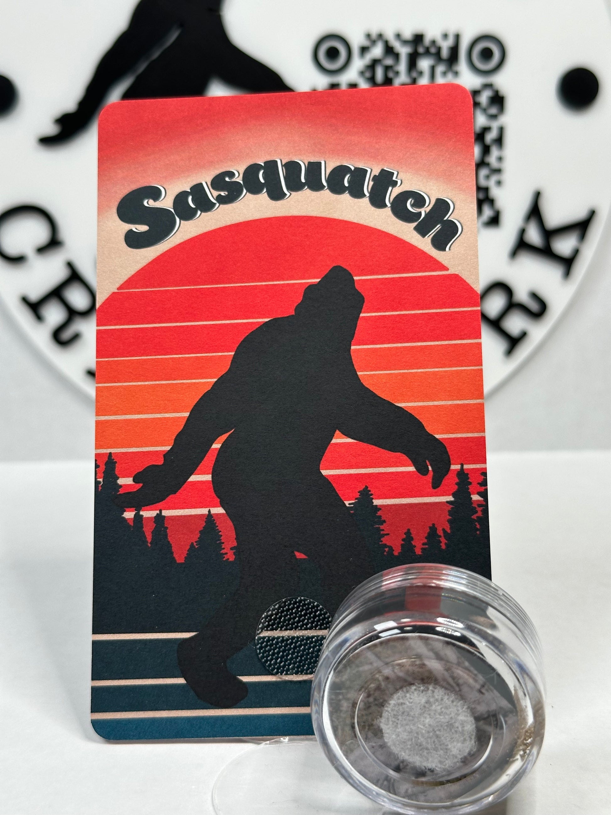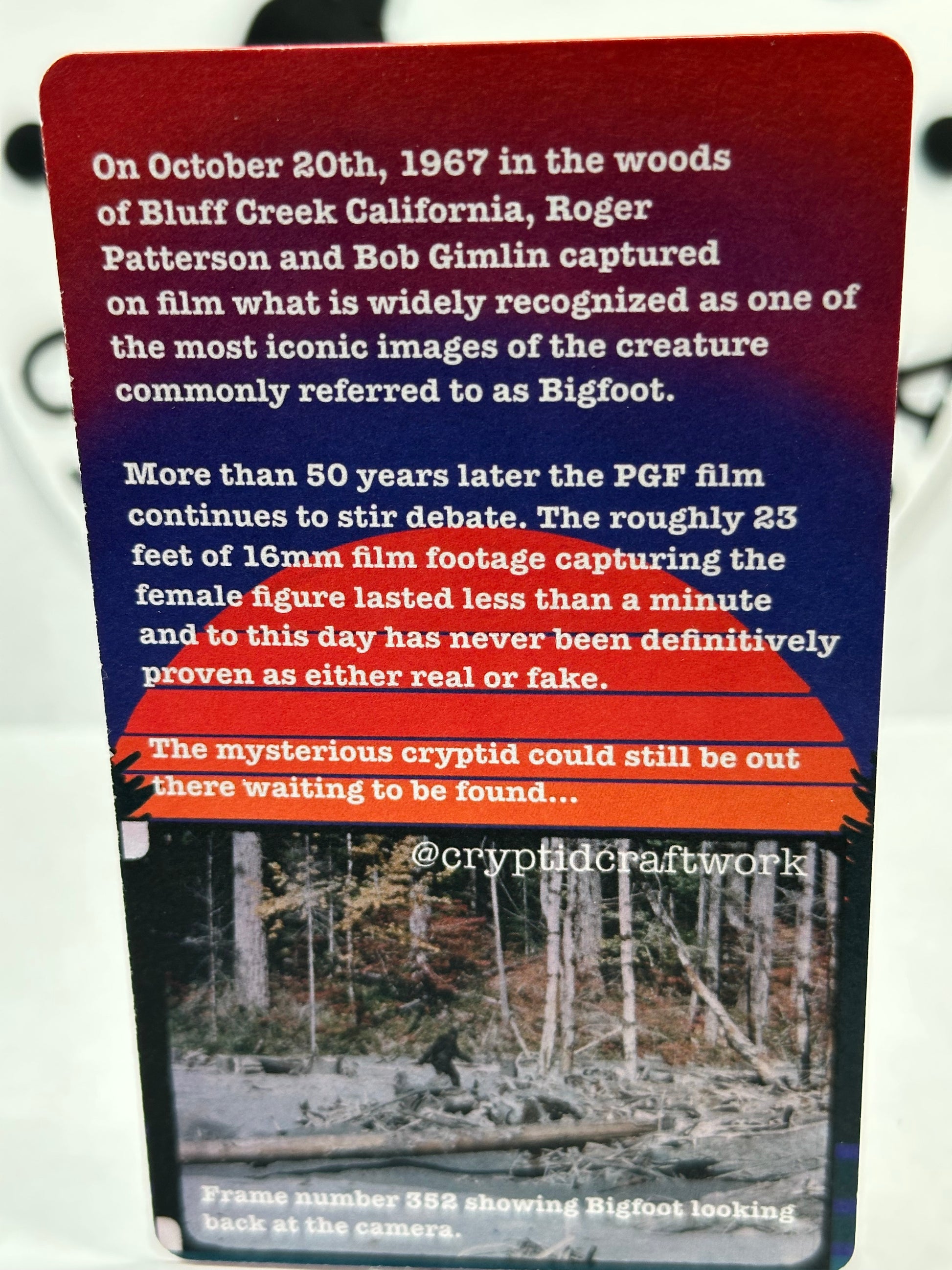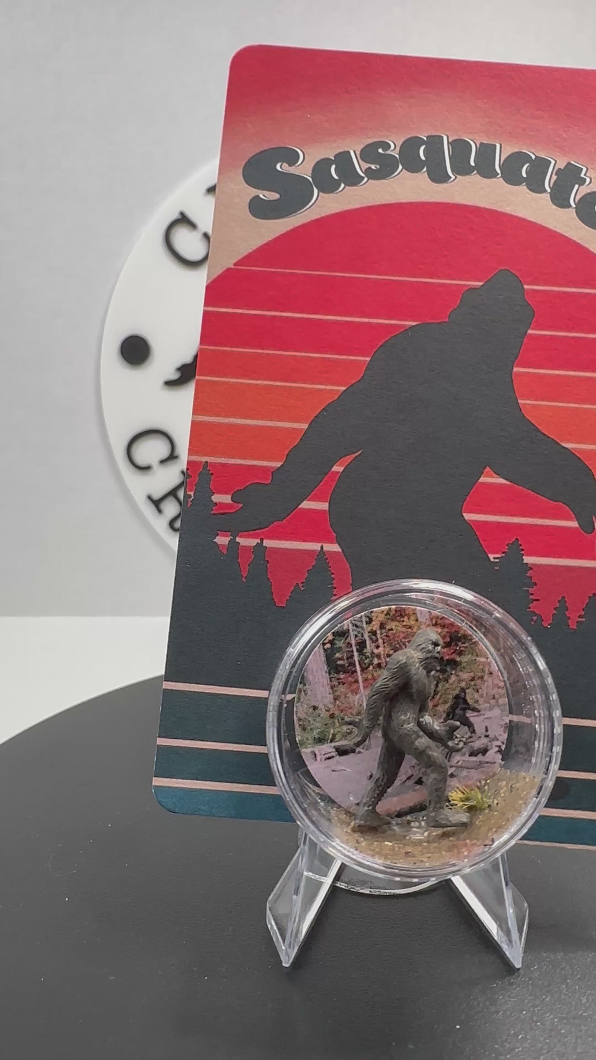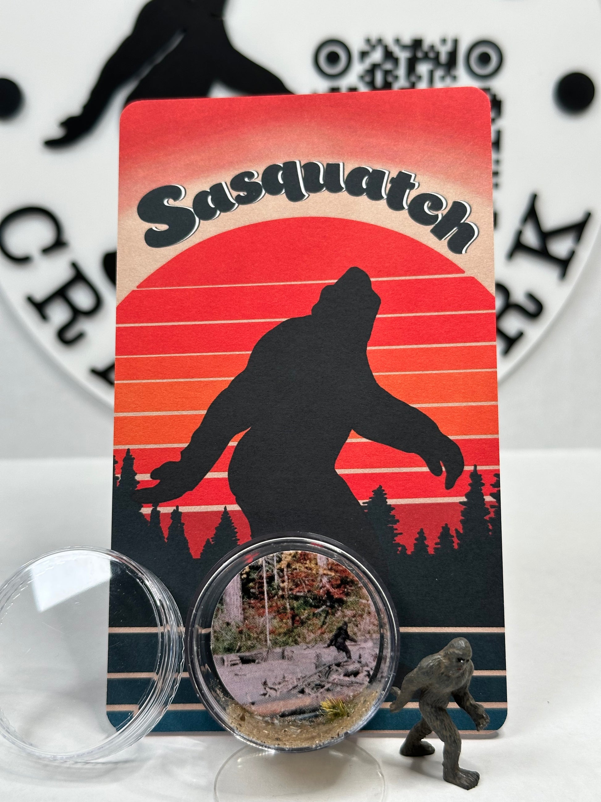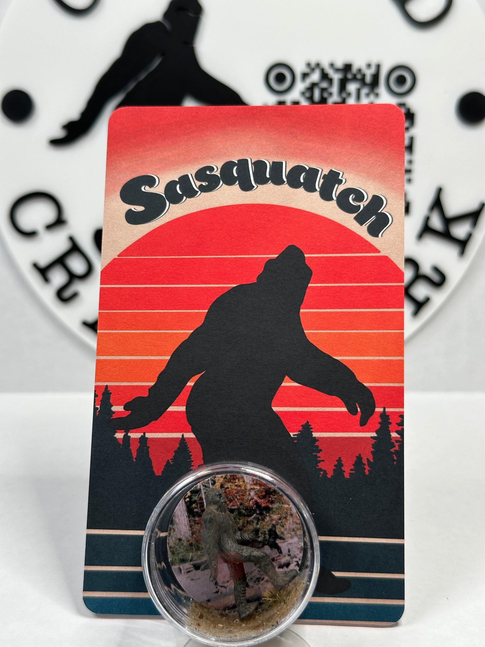 This mini Sasquatch figure measures roughly 1” tall, is mounted to a vintage retro style card that measures inches 3 inches (wide) x 5 inches (tall). The miniature clear terrarium attaches to the custom card with velcro and can be removed or kept as is for display. (clear stand not included)